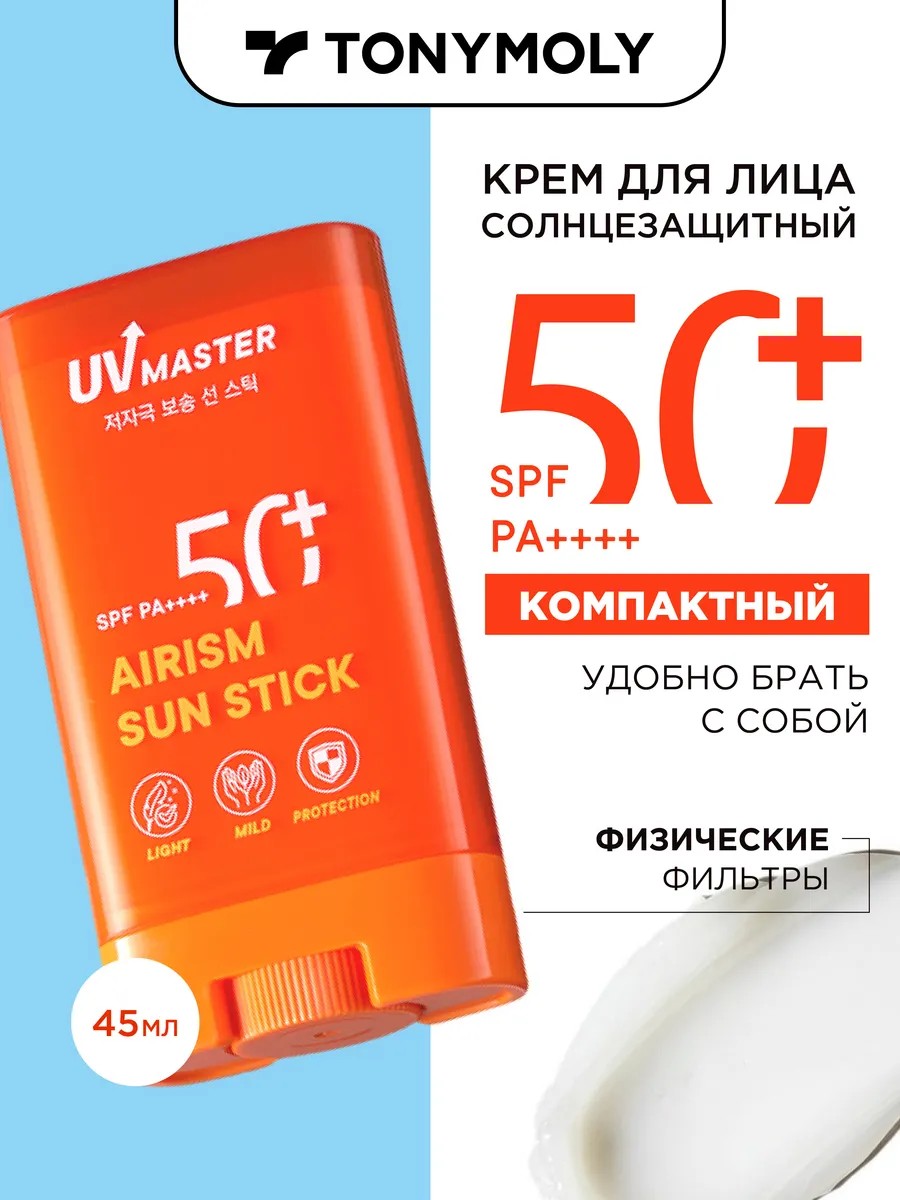 Легкий солнцезащитный крем-стик UV Master Airism Sun Stick для лица и тела защищает кожу от ультрафиолетового излучения, фотостарения кожи, препятствует образованию пигментации. Высокий фактор SPF 50 PA++ защищает кожу от УФ-излучения и предотвращает появление пигментных пятен, тем самым защищает от преждевременного старения кожи. Благодаря комплексу ухаживающих компонентов средство обеспечивает глубокое увлажнение на протяжении длительного времени. Эктоин обеспечивает защиту от обезвоживания и внешних агрессивных факторов, ресвератрол стимулирует естественную антиоксидантную защиту кожи. Витамин D заряжает энергией и гарантирует здоровое сияние кожи, пантенол и каламин успокаивают кожу и обеспечивают невероятный комфорт и увлажненность в течение всего дня. Водостойкая формула обеспечивает надежную защиту от вредного воздействия лучей UVB/UVA позволяет активно заниматься спортом, не беспокоясь об обновлении солнцезащитного средства. Обеспечивает защиту от вредного воздействия уф - лучей и нежелательного загара. Тающая текстура создает невесомое бархатистое покрытие без эффекта маски, что позволяет с легкостью регулировать площадь и интенсивность нанесения. Не заметен на коже, не оставляет эффекта липкости и жирного блеска. Содержит 100% минеральный фильтры. Корейские солнцезащитные средства имеют легкую текстуру, подходит для ежедневного применения. Может использоваться как баз или праймер под bb крем, тональное средство. Крем-стик от загара подходит для всех типов кожи, включая чувствительную детскую жирную комбинированную проблемную. Гипоаллергенный. Дерматологически протестировано. Часто ищут как солнцезащитный увлажняющий крем стик корея sunscreen stick spf50 cream спф стики против пигментных пятен. TONYMOLY - это уходовая корейская косметика для лица и тела. Это отличный подарок для женщин, девушкам, мужчинам.