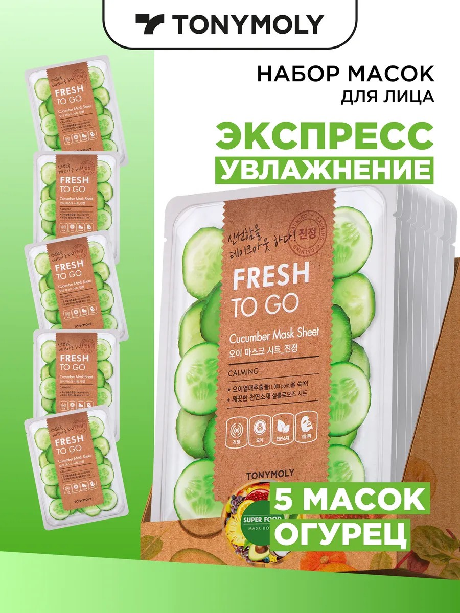 Освежающие тканевые маски TONYMOLY FRESH TO GO активно восстанавливают уставшую кожу, глубоко увлажняют и питают, устраняют тусклость и улучшают цвет лица. Маски насыщают кожу витаминами и микроэлементами, тонизируют, устраняют сухость и стянутость, делают кожу мягкой и бархатистой. Маски подходят для любых особенностей и типов кожи (увлажнение, питание, сужение пор, сияние кожи). Тканевые маски обильно пропитаны питательной эссенцией, которой хватит дополнительно на шею, руки, тело. У масок приятный натуральный аромат свежих фруктов и овощей. Не вызывают аллергии. Можно использовать беременным. Маски не оставляют ощущения липкости, не требуют смывания. Для лучшего эффекта храните их в холодильнике. Ткань у масок плотная, лекало подойдет всем. Способ применения: после этапов очищения и тонизирования нанесите маску на лицо и аккуратно распределите по коже. Через 15-20 минут снимите маску и кончиками пальцев мягко вбейте остатки эссенции. Используйте 1-2 раза в неделю. Освежающая тканевая маска для лица с экстрактом огурца Fresh To Go Cucumber Mask Sheet устраняет жирный блеск, увлажняет, восстанавливает, витаминизирует кожу, успокаивает раздражения, матирует, укрепляет защитный барьер, тонизирует, освежает, насыщает кожу лица натуральными полезными веществами, восстанавливает баланс влаги в коже, оказывает смягчающее действие, обеспечивает шелковистость, устраняет ощущения стянутости, улучшает текстуру кожи. Проверяйте целостность упаковки!