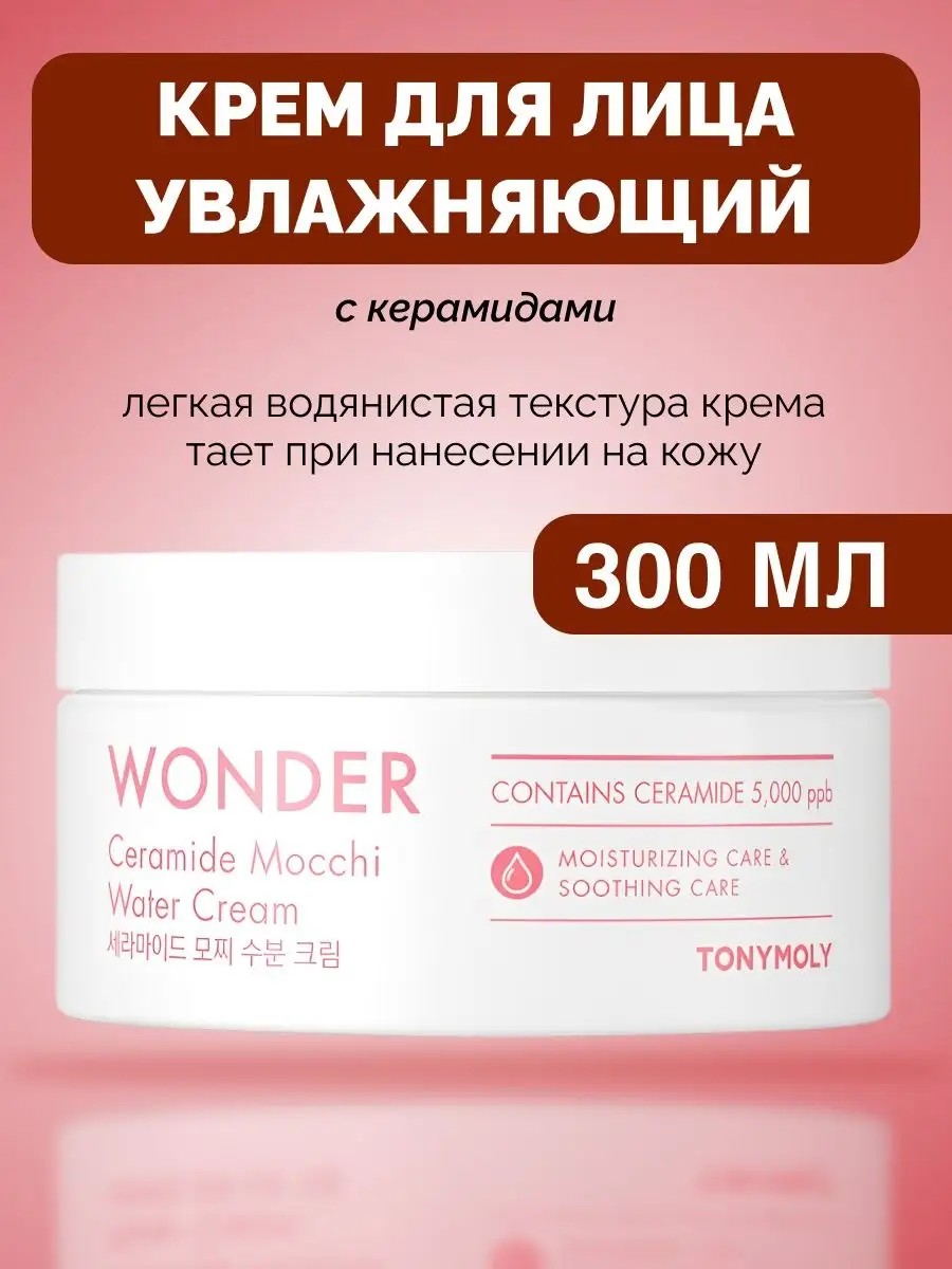 Увлажняющий крем для лица и тела с керамидами TONYMOLY Wonder Ceramide Mochi Water Cream обеспечит эффективный ежедневный комплексный уход за кожей. Крем можно использовать как дневной, так и ночной уход, он подойдет для ухода за кожей лица, тела, рук, а также области вокруг глаз. Крем оказывает самое мягкое воздействие. Нежнейшая текстура мгновенно впитывается в кожу, не оставляя после себя ощущения липкости, не пачкает одежду. Крем прекрасно увлажняет и питает сухую кожу в течение всего дня, создает на коже невесомую вуаль, препятствующую испарению влаги. Регулирует баланс кожи, восстанавливает текстуру, в результате чего кожа становится невероятно мягкой, шелковистой, здоровой и красивой. Питательный крем не закупоривает поры и снижает шелушения. Сбалансированная формула крема интенсивно питает и увлажняет, смягчает и успокаивает сухую кожу, делая ее нежной и гладкой. Основной активный компонент крема – керамиды - липиды, наполняющие кожу жизненной энергией и повышающие ее защитные функции. Они интенсивно увлажняют, предупреждают риск обезвоживания клеток, защищает дерму от внешних негативных факторов, способствуют восстановлению липидного барьера кожи, успокаивают и снимают шелушения, делают кожу более гладкой и шелковистой. Гидрогенизированный лецитин отлично восстанавливает барьерные функции кожи, глубоко питает ее и защищает клетки от повреждения свободными радикалами. Масло цедры лимона оказывает антиоксидантное, осветляющее, тонизирующее действие, укрепляет стенки сосудов. Масло розового дерева способствует увлажнению и восстановлению эластичности кожи, обладает очень выраженным бактерицидным действием, поэтому улучшает состояние при акне, угревой сыпи, дерматитах и экземах. Восстанавливающий крем подходит для всех типов кожи, включая сухую, жирную, комбинированную и чувствительную. Наша продукция станет отличным подарком маме, сестре, подруге или учителю на новый год, день рождения, 8 марта и другие праздники.