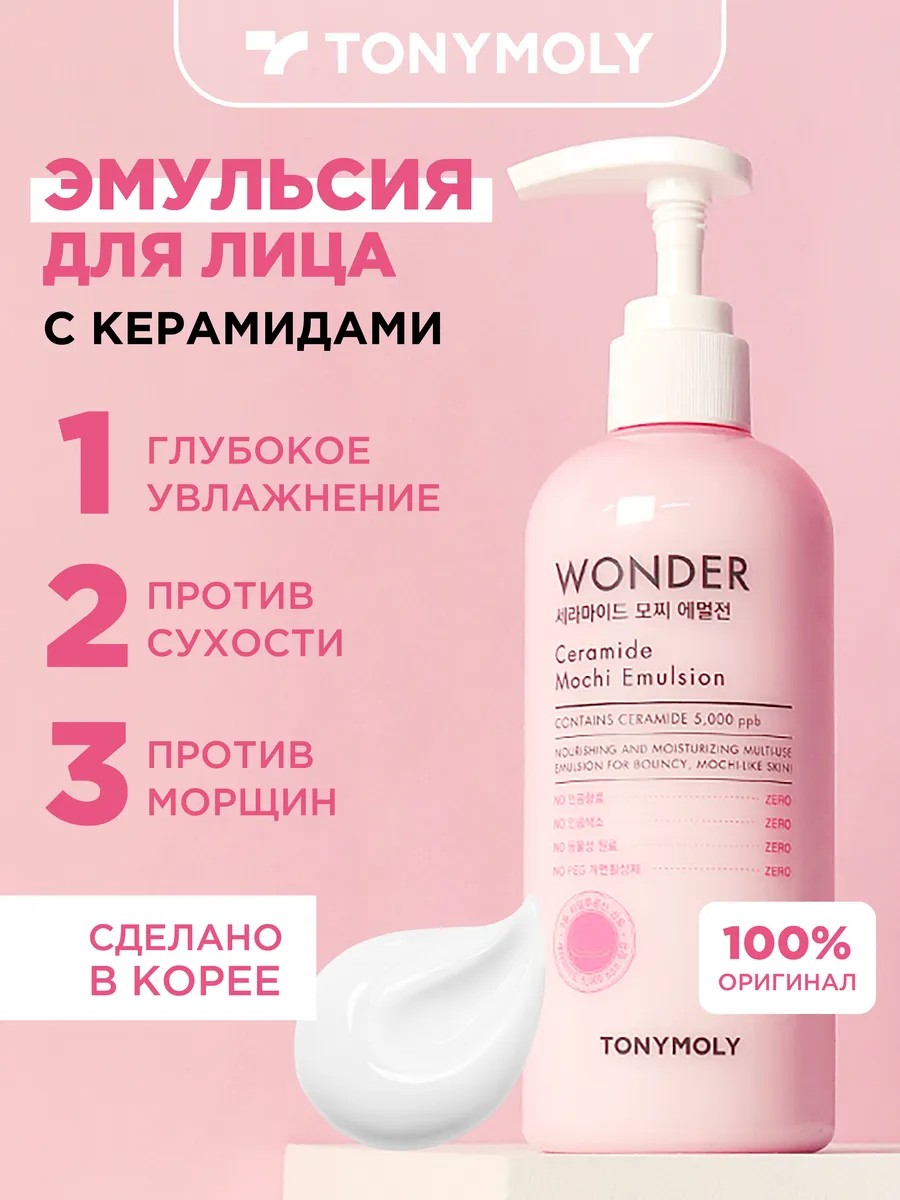 Увлажняющая эмульсия (лосьон) для лица с керамидами Wonder Ceramide Mochi Emulsion, 300 мл. / Корея. Универсальная эмульсия для лица прекрасно увлажняет и питает кожу в течение всего дня, создает на коже невесомую вуаль, препятствующую испарению влаги. Регулирует баланс кожи, восстанавливает текстуру, в результате чего кожа становится невероятно мягкой и шелковистой. Универсальное средство сочетает в себе функции эссенции и крема, позволяет сохранить кожу увлажненной в течение долгого времени. Керамиды и 3 типа гиалуроновой кислоты в составе связывают влагу в клетках кожи, восстанавливают межклеточный цемент, создавая эффект "Mochi skin", напитанной и увлажненной кожи. Так же ищите как ламеллярная эмульсия для лица.