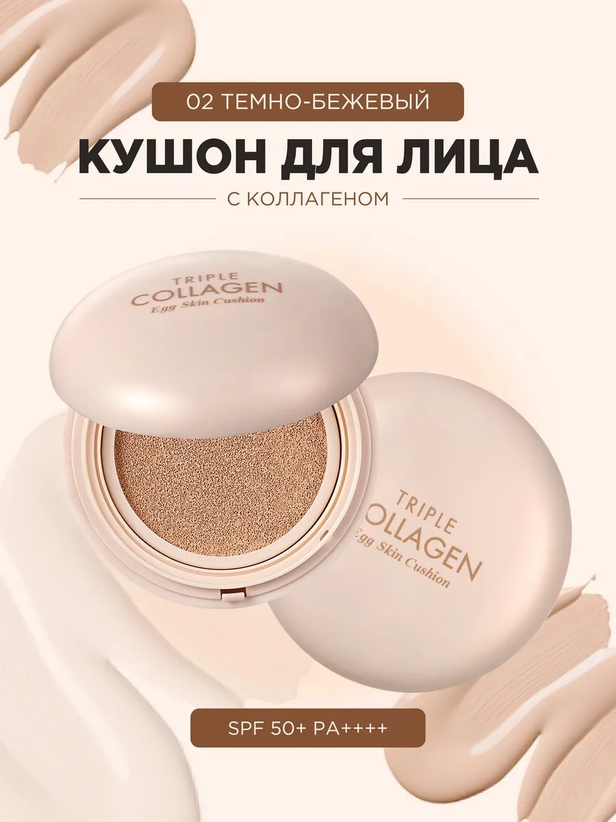 Корейский тональный крем-кушон с тройным комплексом коллагена Triple Collagen Complex идеально сливается с кожей и обеспечивает естественный блеск без эффекта маски.