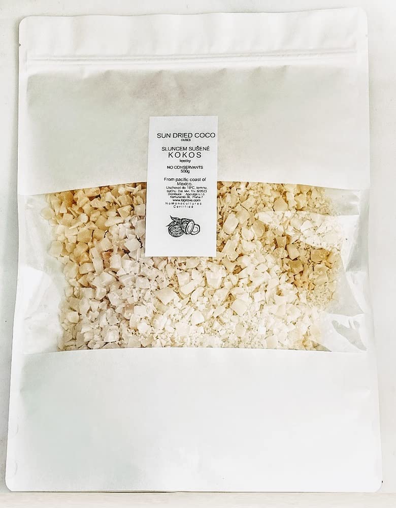 Coconuts are the fruit of cocos nucifera or coconut palm. The core inside the fibrous green shell contains the edible flesh and refreshing milk of the coconut. Dry coconut is known as "copra" and is made by removing the husk of the ripe coconut and cracking open the core to release the meat and liquid within. The meat is then dried using one of two methods: air and sun drying or hot air drying. In India this is done in a heated tunnel in the Philippines an oven-heated process is used.Zongedroogde kokosnoot-kopra-kubus uit de Pacifische Mexico, 500 g Kokosnoten zijn de vrucht van cocos nucifera of kokospalm. De kern in de vezelachtige groene schaal bevat het eetbare vlees en de verfrissende melk van de kokosnoot. Droge kokosnoot staat bekend als "copra" en wordt gemaakt door de schil van de rijpe kokosnoot te verwijderen en de kern te openbreken waardoor het vlees en de vloeistof erin vrijkomen. Het vlees wordt vervolgens met een van de twee methoden gedroogd: drogen aan de lucht en zon of heteluchtdrogen. In India gebeurt dit in een verwarmde tunnel in de Filippijnen wordt een ovenverwarmd proces gebruikt.