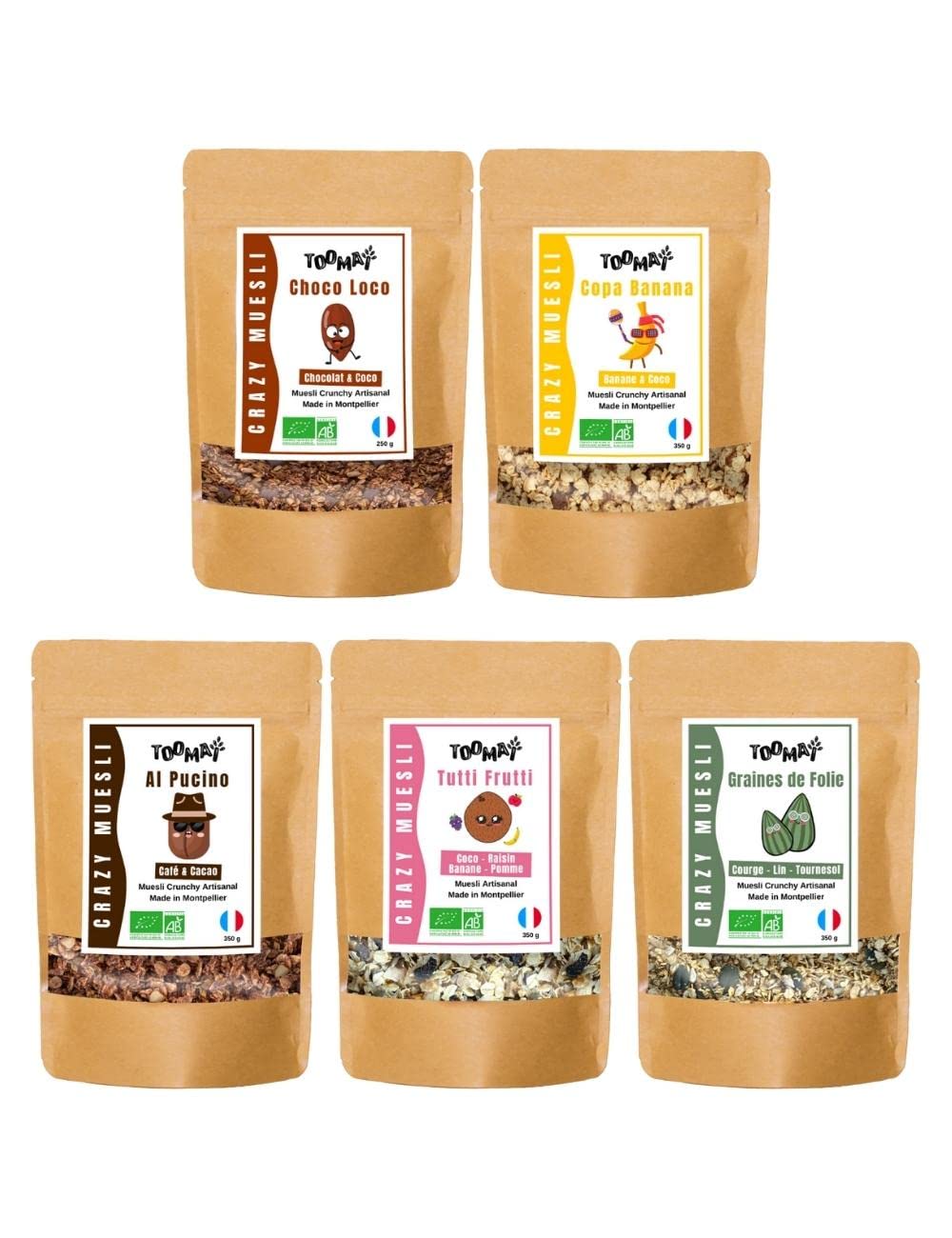 Totally CRAZY and French mueslis! Yum. Whole grains. No refined sugars. Ultra-nutritious. Organic and handcrafted. 5 bags.? CONTENTS: 1 x 250g CHOCO LOCO - 1 x 350g GRAINES DE FOLIE - 1 x 350g TUTTI FRUTTI - 1 x 350g COPA BANANA - 1 x 350g AL PUCINO. Net weight: 1.65 kg. THE ECO-FRIENDLY BIGGER: Enriched with ancient seeds that save the soil, sorghum and einkorn! 100 eco-bulk format. ARTISANAL: We handcraft all our mueslis in a charity bakery near Montpellier. REALLY NOURISHES: Rich in natural fibers essential for maintaining a healthy microbiota. Zero guilt with 30 to 50 less sugar (compared to the average crunchy chocolate muesli (Ciqual, 2022)). Source of manganese. NATURAL ORGANIC INGREDIENTS: A clean composition and ingredients from organic farming. We say no to artificial flavors, additives, preservatives and refined sugars!. YUMMY: Various crunchy or flaky organic mueslis with flavors that will blow you away. Discover our CRUNCHY Choco Loco (Chocolate Coconut), Graines de Folie (flax, sunflower, pumpkin), Copa Banana (Banana Coconut) and Al Pucino (Coffee Cocoa) mueslis as well as our protein-rich flaky muesli Tutti Frutti (Coconut - Raisin - Banana - Apple) for mornings that swing! The first ultra-gourmet Crazy Mueslis that are incredibly filling for YUMMY and 100 FEEL GOOD breakfasts! Mueslis complètement CRAZY et français ! Miam. Céréales complètes. Sans sucres raffinés. Ultra-nourrissants. Bio et fabrication artisanale. 5 sachets.? CONTENU : 1 x 250g CHOCO LOCO - 1 x 350g GRAINES DE FOLIE - 1 x 350g TUTTI FRUTTI - 1 x 350g COPA BANANA - 1 x 350g AL PUCINO. Poids net :1,65 kg. LE ECO-FRIENDLY : Enrichie en graines anciennes qui sauvent les sols, sorgho et petit épeautre ! Format 100 éco-vrac. ARTISANAL : Nous fabriquons artisanalement tous nos mueslis au sein d'une boulangerie solidaire à côté de Montpellier. NOURRIT VRAIMENT : Riche en fibres naturelles essentielles au maintien d'un microbiote en bonne santé. Zéro culpabilité avec 30 à 50 de sucres en moins (par rapport à la moyenne des mueslis croustillants au chocolat (Ciqual, 2022)). Source de manganèse. DES INGRÉDIENTS NATURELS BIO : Une composition propre et des ingrédients issus de l'agriculture biologique. On dit non aux arômes artificiels, aux additifs, aux conservateurs et aux sucres raffinés !. DU MIAM : Divers mueslis croustillants ou floconneux BIO aux saveurs qui vont te renverser. Découvre nos mueslis CRUNCHY Choco Loco (Chocolat Coco) Graines de Folie (lin, tournesol, courge), Copa Banana (Banane Coco) et Al Pucino (Café Cacao) ainsi que notre muesli floconneux riche en protéines Tutti Frutti (Coco - Raisin - Banane - Pomme) pour des matins qui swinguent !. Les premiers Crazy Mueslis ultra gourmands qui nourrissent de OUF pour des petits-déjeuners MIAM et 100 FEEL GOOD !.