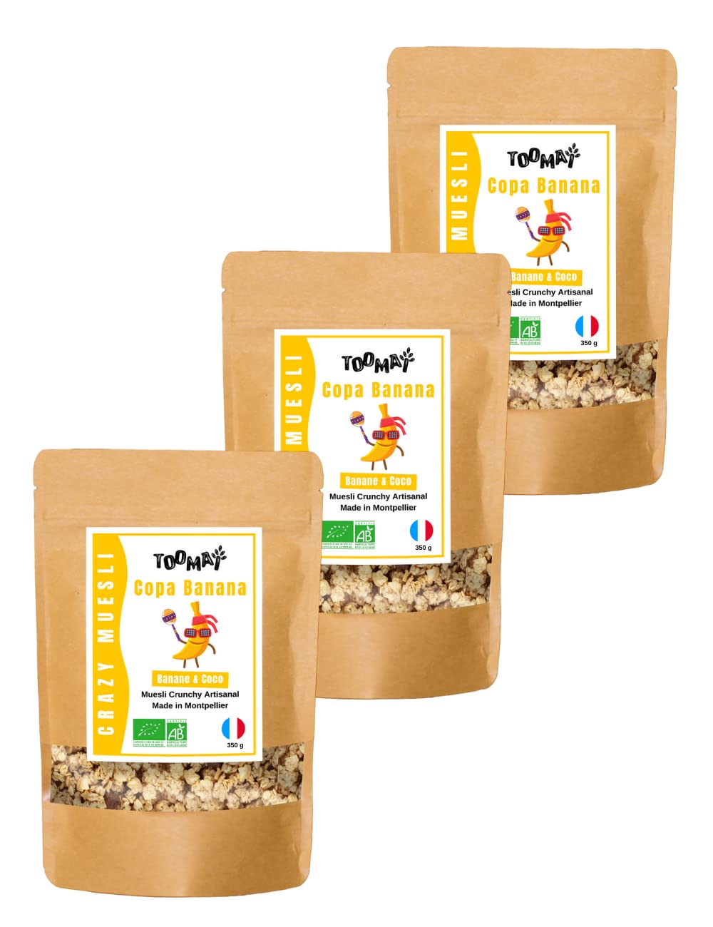 Organic crunchy muesli with Banana and Coconut for a unique taste. Whole grain. No refined sugars. French artisanal production. Pack of 3 x 350 g. INGREDIENTS Allergens: Gluten. Made in Occitanie in a factory that uses cereals, milk, eggs, mustard, sesame, soy, peanuts and other nuts. Storage: Store in a cool, dry place away from light and tightly closed.? CONTENTS: 3 x 350g Doypacks Crispy Copa Banana Muesli. Banana Coconut flavor. Net weight bag: 350g. THE ECO-FRIENDLY BENEFIT: Enriched with ancient seeds that save the soil, sorghum and einkorn! 100 eco-bulk format. ARTISANAL: We handcraft all our mueslis in a charity bakery near Montpellier. REALLY NOURISHES: Rich in natural fibers essential for maintaining a healthy microbiota. Zero guilt with 30 less sugar (compared to the average crunchy chocolate muesli (Ciqual, 2021)). Source of manganese. NATURAL ORGANIC INGREDIENTS: A clean composition and ingredients from organic farming. We say no to artificial flavors, additives, preservatives, and refined sugars! YUMMY: The exotic flavor of banana and coconut. And crunch-crunch! The first ultra-gourmet crazy muesli that nourishes you like CRAZY for healthy and 100 FEEL GOOD breakfasts! Muesli croustillant BIO à la Banane et la Noix de Coco pour un goût unique. Céréales complètes. Sans sucres raffinés. Fabrication artisanale française. Pack 3 x 350 g. INGRÉDIENTS Allergènes : Gluten. Fabriqué en Occitanie dans un atelier qui utilise céréales, lait, œufs, moutarde, sésame, soja, arachides et autres fruits à coque. Conservation : À conserver dans un endroit frais et sec à l'abri de la lumière et fermé hermétiquement.? CONTENU : 3 x 350g Doypacks Muesli croustillant Copa Banana. Saveur Banane Coco. Poids net sachet : 350g. LE ECO-FRIENDLY : Enrichie en graines anciennes qui sauvent les sols, sorgho et petit épeautre ! Format 100 éco-vrac. ARTISANAL : Nous fabriquons artisanalement tous nos mueslis au sein d'une boulangerie solidaire à côté de Montpellier. NOURRIT VRAIMENT : Riche en fibres naturelles essentielles au maintien d'un microbiote en bonne santé. Zéro culpabilité avec 30 de sucres en moins (par rapport à la moyenne des mueslis croustillants au chocolat (Ciqual, 2021)). Source de manganèse. DES INGRÉDIENTS NATURELS BIO : Une composition propre et des ingrédients issus de l'agriculture biologique. On dit non aux arômes artificiels, aux additifs, aux conservateurs et aux sucres raffinés !. DU MIAM : La saveur exotique de la banane et de la noix de coco. Et du crunch-crunch !. Le premier crazy muesli ultra gourmand qui nourrit de OUF pour des petits-déjeuners sains et 100 FEEL GOOD !.