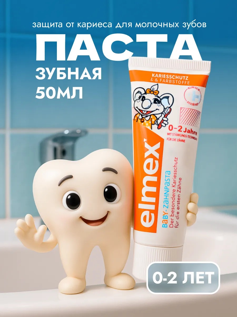 Elmex Children's Fluoride Toothpaste is specially formulated to protect baby teeth from cavities. This toothpaste is designed for children aged 0-2 years for daily care and protection of soft, immature enamel. Suitable for use from the moment the first tooth appears. Elmex Children's Fluoride Toothpaste has a pleasant, mild, but not sweet taste, which prevents children from swallowing the toothpaste. It has been scientifically proven that brushing children's teeth with fluoride toothpaste from the first baby tooth is beneficial and effective. The fluoride in Elmex toothpaste forms a stable layer of calcium fluoride on the tooth surfaces, which restores and strengthens enamel and protects against cavities. Elmex Children's Fluoride Toothpaste contains the dentist-recommended fluoride concentration of 1000 ppm. This mint toothpaste 0-2 is free of preservatives and dyes. Strengthening toothpaste for children helps strengthen enamel and prevent cavities. Parents should brush their child's teeth once a day until age 2. Brush for 3 minutes, using a pea-sized amount of toothpaste (approximately 1.0 g). Brush in a circular motion, gently massaging the gums. Provide double protection for your teeth with Elmex Baby toothpaste to prevent cavities.