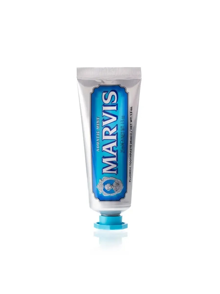 Marvis is a fantastic toothpaste from Florence, renowned for over 60 years. The pastes boast a unique creamy texture and excellent cleaning properties. Cellulose resin gives the paste a creamy consistency and prevents it from drying out and peeling. Xylitol protects and strengthens teeth, and gentle abrasives gently remove plaque and polish enamel without damaging or scratching. The vintage-style tubes are especially noteworthy. The toothpaste tube is made of environmentally friendly aluminum, which is recycled responsibly. The refreshing scent of the sea with a light, cooling hint of mint: the perfect combination for immersing yourself in an ocean of freshness. Ingredients: Glycerin, Aluminum, Hydroxide, Aqua, Silica, Aroma, Cellulose Gum, Titanium Dioxide, Xylitol, Sodium Lauryl Sulfate, Sodium Saccharin, Sodium Fluoride, Citric Acid, Sodium Citrate, Hydroxycitronellal, Farnesol.