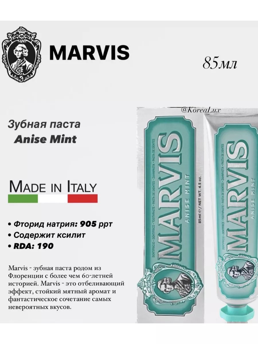 Зубная паста Marvis Anise Mint — отличное решение по комплексному уходу за гигиеной ротовой полости. Отбеливающая зубная паста от Marvis поддерживает зубы и десна в здоровом состоянии, избавляет от остатков еды и зубного налета, а также освежает дыхание. Монофторфосфат натрия укрепляет и защищает зубную эмаль от кариеса. Бикарбонат натрия удаляет налет, вызванный употреблением кофе и чая, курением, придавая улыбке роскошную белизну. Люксовая зубная паста мягко полирует зубы, не повреждая эмаль. Особая технология мелкодисперсной массы создает плотную, однородную текстуру, усиливающую неповторимые ароматы зубной пасты MARVIS. Средство для чистки зубов подарит вам белоснежную улыбку, свежее дыхание и отличное настроение на весь день! Пряные ноты звездчатого аниса в сочетании с взрывной свежестью мяты. Массовая доля фторида 0.0905%. Это фантастическая паста для зубов из Флоренции, которая известна более 60 лет. Итальянская паста для зубов от кариеса отличаются уникальной кремообразной текстурой и отличными очищающими свойствами. Входящая в состав целлюлозная смола делает зубную пасту от налета похожей на густые сливки и предотвращает ее высыхание и расслоение, ксилитол защищает зубы от кариеса и укрепляет, а деликатные абразивные вещества бережно удаляют зубной налет и мягко полируют эмаль, не повреждая и не царапая ее. Уровень абразивности пасты – 105 RDA, содержит в себе частички диоксида кремния, наиболее безопасного для зубов природного абразива, который эффективно, но мягко удаляет налет и полирует эмаль, не повреждая ее. Сначала марка зубной пасты Марвис выпускала продукцию, ориентируясь на курящую аудиторию для курящих, поэтому помимо отличных очищающих свойств Marvis сочетает в себе отбеливающий эффект и стойкий мятный аромат. В пастах Марвис больших объемов (85мл) тюбик не закрывается защитной фольгой под крышкой. Такая упаковка предусмотрена самим производителем.