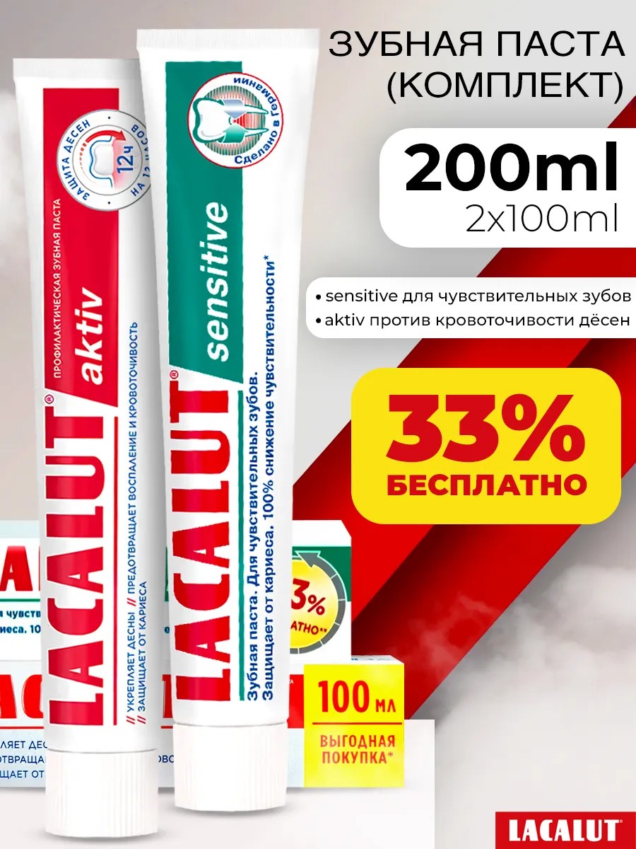 | Комплектация | Зубная паста LACALUT sensitive для чувствительных зубов 100 грамм 1 шт.; Зубная паста LACALUT актив против кровоточивости 100 грамм 1 шт. |