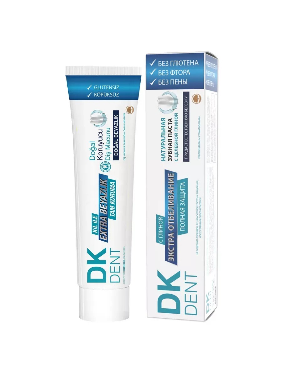 DK DENT toothpaste differs from other toothpastes in its composition. It is free of fluoride, foam, parabens, animal fats, gluten, triclosan, artificial sweeteners, and colorants. It contains natural white clay, which ensures natural whiteness of teeth, freshens breath, protects tooth enamel, and relieves gum inflammation. DK DENT toothpaste also helps remove plaque caused by cigarettes, tea, and coffee without damaging tooth enamel. It strengthens tooth enamel thanks to clay and mineral supplements such as calcium. DK DENT whitening toothpaste ensures complete oral hygiene and cleaning. Contains a natural sweetener from the stevia plant and is suitable for use by children and people with diabetes. Its slightly alkaline properties maintain the alkaline balance in the mouth and prevent enamel erosion. The clay in this toothpaste neutralizes acidity in the mouth caused by food and helps prevent cavities. Minerals such as silica, magnesium, potassium, copper, phosphorus, and zinc promote tooth mineralization, which strengthens teeth. Peppermint extract eliminates bad breath, effectively kills germs, and strengthens gums and teeth. Omega 3 reduces gum inflammation and promotes regeneration. Grape seed oil effectively combats bleeding gums. Propolis and honey disinfect and promote healing of the oral mucosa. Activated charcoal whitens, disinfects, and cleans teeth, and also has antioxidant properties. This toothpaste is a perfect gift for holidays, birthdays, Ramadan, Flag Day, Independence Day, and International Women's Day. It is hypoallergenic and halal. It makes a great gift for mom, friend, colleague, or family. Suitable as a children's toothpaste. The ingredients are similar to Korean toothpaste. Store the toothpaste in a cool, dry place, away from direct sunlight.