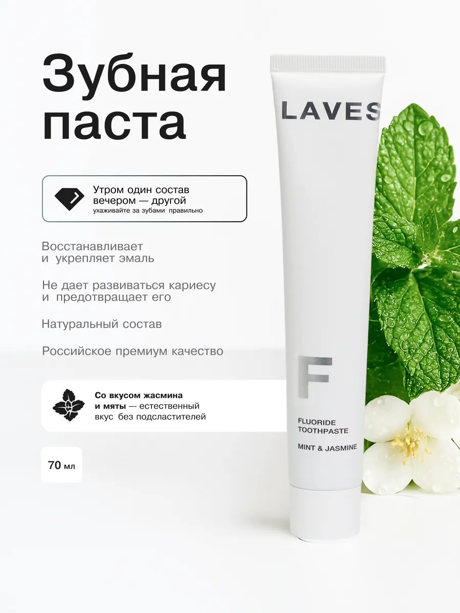 Evening Fluoride Toothpaste is a next-generation professional product designed for high-quality and safe oral care at the end of the day. Thanks to premium Russian quality, a natural formula, and a scientifically sound selection of ingredients, this toothpaste provides deep cleansing and care for the health of teeth and gums, even for the most sensitive consumers. The rich flavor of jasmine combined with refreshing mint makes your evening ritual especially pleasant. This toothpaste is suitable for adults and teenagers, including those with braces. It is designed as a universal product: it fits perfectly into both home care and travel cosmetics. The formula with zinc citrate actively fights plaque and protects against tartar formation. Thanks to natural enzymes and remineralizing ingredients, the product strengthens enamel, reduces the risk of cracks and erosions, helps remove stains, and freshens breath for up to 24 hours. This is especially important for those who suffer from bad breath in the morning, smokers, or those with sensitive teeth. It contains no parabens, SLS, harsh abrasives, or synthetic fragrances, making it completely safe even with regular use. Its unique formula was developed by a dentist and is clinically proven. This natural night toothpaste effectively fights cavities, protects gums from inflammation and bleeding, and promotes thorough cleaning without damaging enamel. Treat yourself to a feeling of cleanliness and freshness before bed – use it with our LAVES morning toothpaste for a complete set for comprehensive dental and gum health.