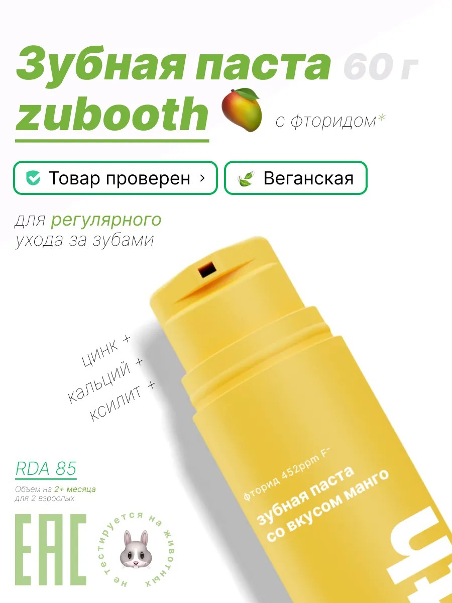Zubooth toothpaste for regular dental care with mango flavor. 60 g, RDA 85. This toothpaste is for daily use, contains 452 ppm fluoride, and has a non-irritating minty flavor. Gel form - half a pump produces enough foam. Based on personal observations and customer reviews, two adults can brush their teeth twice a day for approximately two months. The quality of this toothpaste is confirmed by the EAEU Declaration of Conformity.