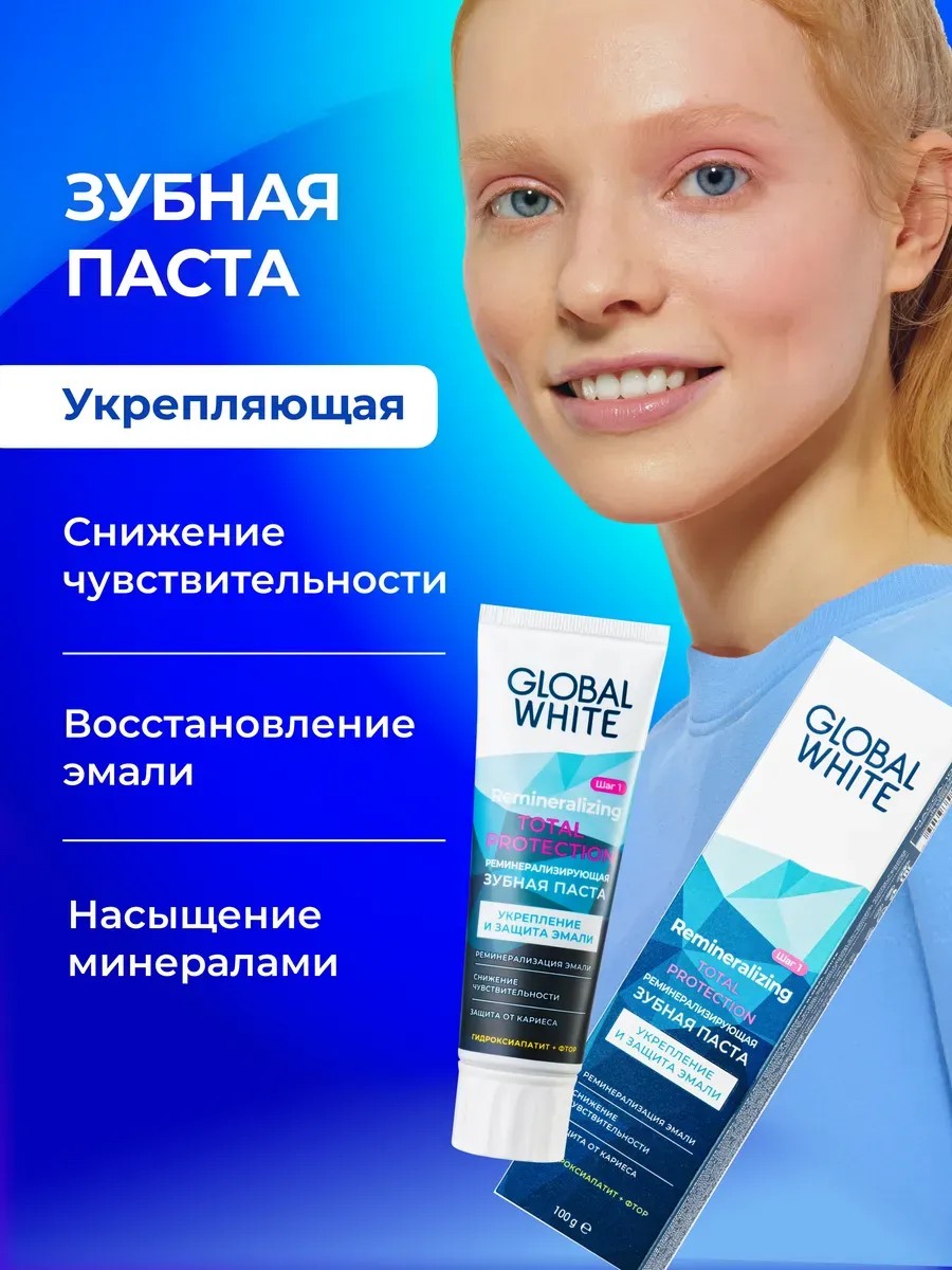 A remineralizing toothpaste with hydroxyapatite and kelp extract to strengthen enamel and reduce and prevent sensitivity. HYDROXYAPATITE, a remineralizing and sensitivity-reducing ingredient, works with fluoride to effectively restore and strengthen enamel. VITAMINS A, C, and E activate metabolic processes in the oral cavity, protecting and strengthening gums. XYLITOL, a naturally occurring ingredient, helps suppress cariogenic bacteria and prevent plaque formation. LAMINARIA EXTRACT nourishes teeth and gums with microelements and has a stimulating and toning effect. It's no secret that toothpaste is the foundation of dental care, so it's important to choose it carefully. GLOBAL WHITE offers a series of toothpastes formulated with British Hydrated Silica, a high-viscosity, low-abrasive ingredient that promotes effective cleaning and gentle, yet gentle, whitening. The mineral-rich toothpaste line includes several toothpastes. Total Protection toothpaste with vitamins A, E, and C, hydroxyapatite, xylitol, and algae extract remineralizes enamel, reduces tooth sensitivity, and fights cavities. You can purchase sets of 2 toothpastes. All toothpastes have a pleasant fruity flavor and a fresh minty scent. They perfectly freshen breath and help maintain the health and beauty of teeth. These toothpastes are suitable for cleaning braces and dentures. Natural products with a mineral complex are suitable for smokers and those with sensitive teeth, preventing pain. They can be used by adults, men, and women, as well as teenagers. You can give such a toothpaste to your mother or grandmother. We have promotions and sales, so you can buy our products as gifts at a discount.