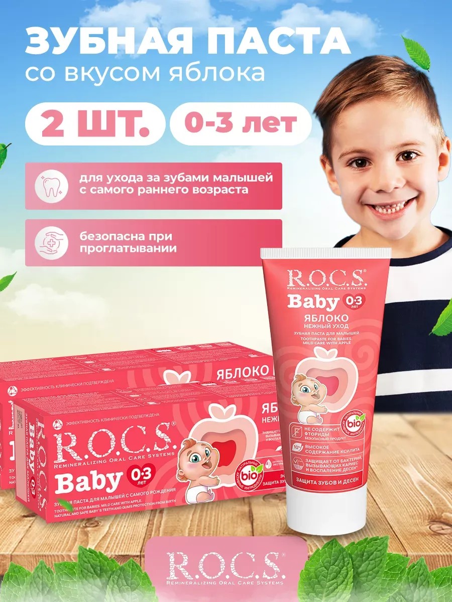 Комплексный набор зубной пасты ( 2 шт ) для мам и малышей Rocs Baby Нежный Уход со вкусом яблока с высокой концентрацией ксилита, благодаря чему обеспечивается устойчивость зубов к растворяющему действию кислот, надёжная защита дёсен от воспаления, защита зубов от кариеса, бактерий. Предназначена для ухода за зубами детей, начиная с самого раннего возраста. Ароматизатор, изготовленный на основе натуральных компонентов придает зубной пасте нежный вкус натурального яблочного пюре, который доставит удовольствие вашему малышу. Безопасна при проглатывании! Не содержит фтор, отдушки, красители, лаурилсульфат натрия и парабены. Свойство пасты быстро образовать защитный слой очень важна, так как многие дети не выдерживают рекомендованное время чистки зубов (3 минуты). РОКС не травмирует ткани зубов (RDA 45). Для чистки зубов малышей рекомендуется использовать небольшое количество пасты. Надеемся увидеть вас в числе наших покупателей, с любовью, ваш Рокс.