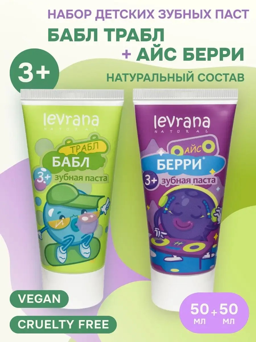 A great value set of two popular children's toothpastes from Levrana. This natural children's toothpaste with a high aloe content and a mild abrasive system gently cleanses enamel, removes plaque, and helps maintain oral immunity. Hydroxyapatite mineral particles restore and strengthen damaged enamel, sealing open dentinal tubules, thereby providing a "micro-filling" effect. Xylitol has antibacterial properties and accelerates the remineralization process. Low abrasiveness level RDA 30-40. Sugar-free, fluoride-free, safe if swallowed. Caries prevention. Directions for use: Apply the paste to your toothbrush, brush your teeth, and rinse your mouth with water. It is recommended to brush your teeth at least twice a day. We have promotions and sales; you can buy our products as gifts at a discount!