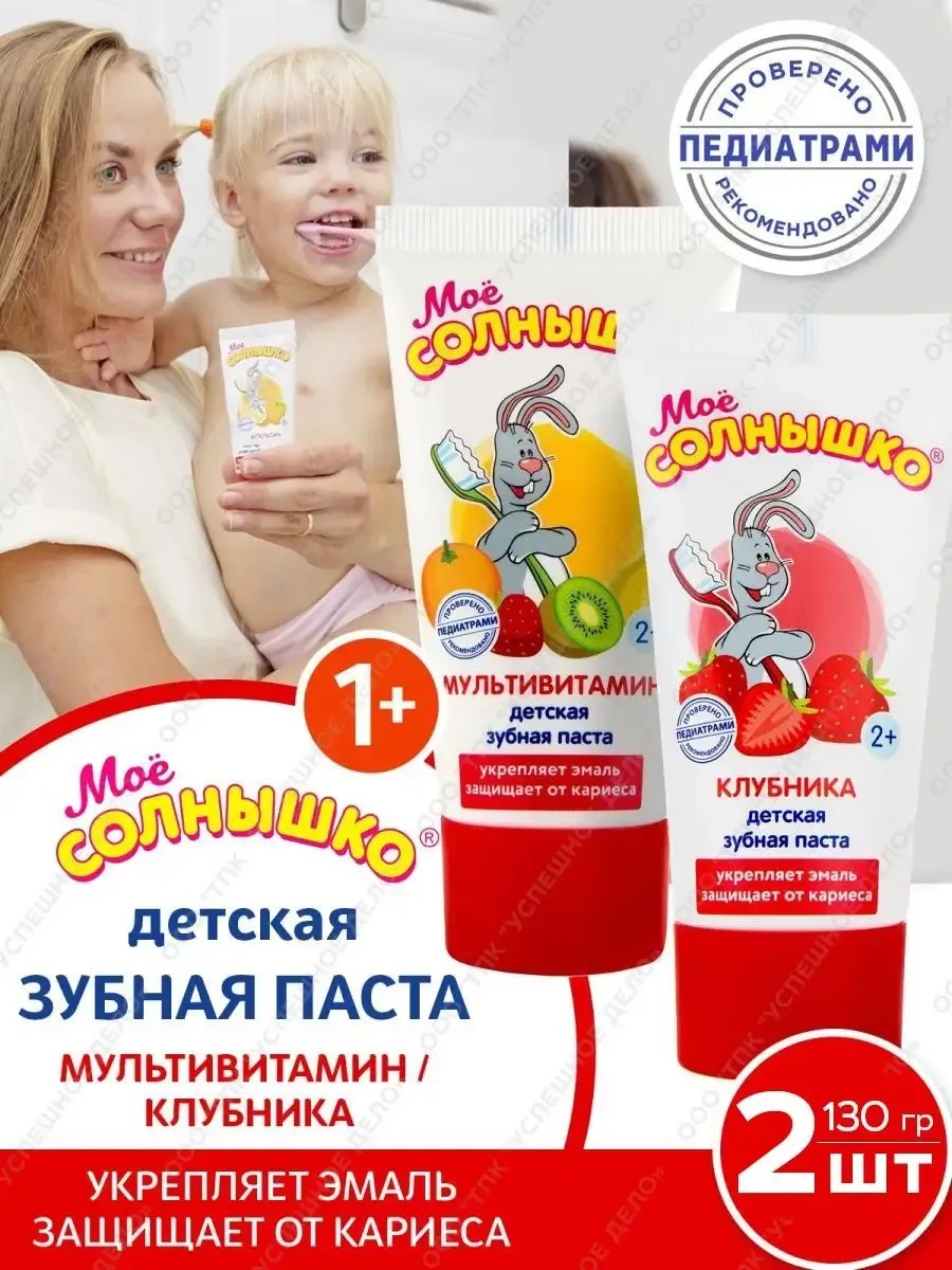 Детская зубная паста МОЁ СОЛНЫШКО разработана для ежедневного ухода за молочными и постоянными зубами ребенка. Обладает мягким очищающим действием. Хорошо пенится. Не содержит сахар. Оптимальное содержание фтора исключает передозировку при случайном проглатывании. Отличный вкус и аромат пасты понравится детям и поможет привить им привычку регулярно чистить зубы. Специальный комплекс кальция и фтора укрепляет зубную эмаль, способствует ее восстановлению и обеспечивает надежную защиту от кариеса. Гипоаллергенно, проверено и рекомендовано педиатрами для детей в возрасте от 2 лет. Формула создана для сведения к минимуму риска аллергической реакции в случае индивидуальной непереносимости ингредиентов состава.