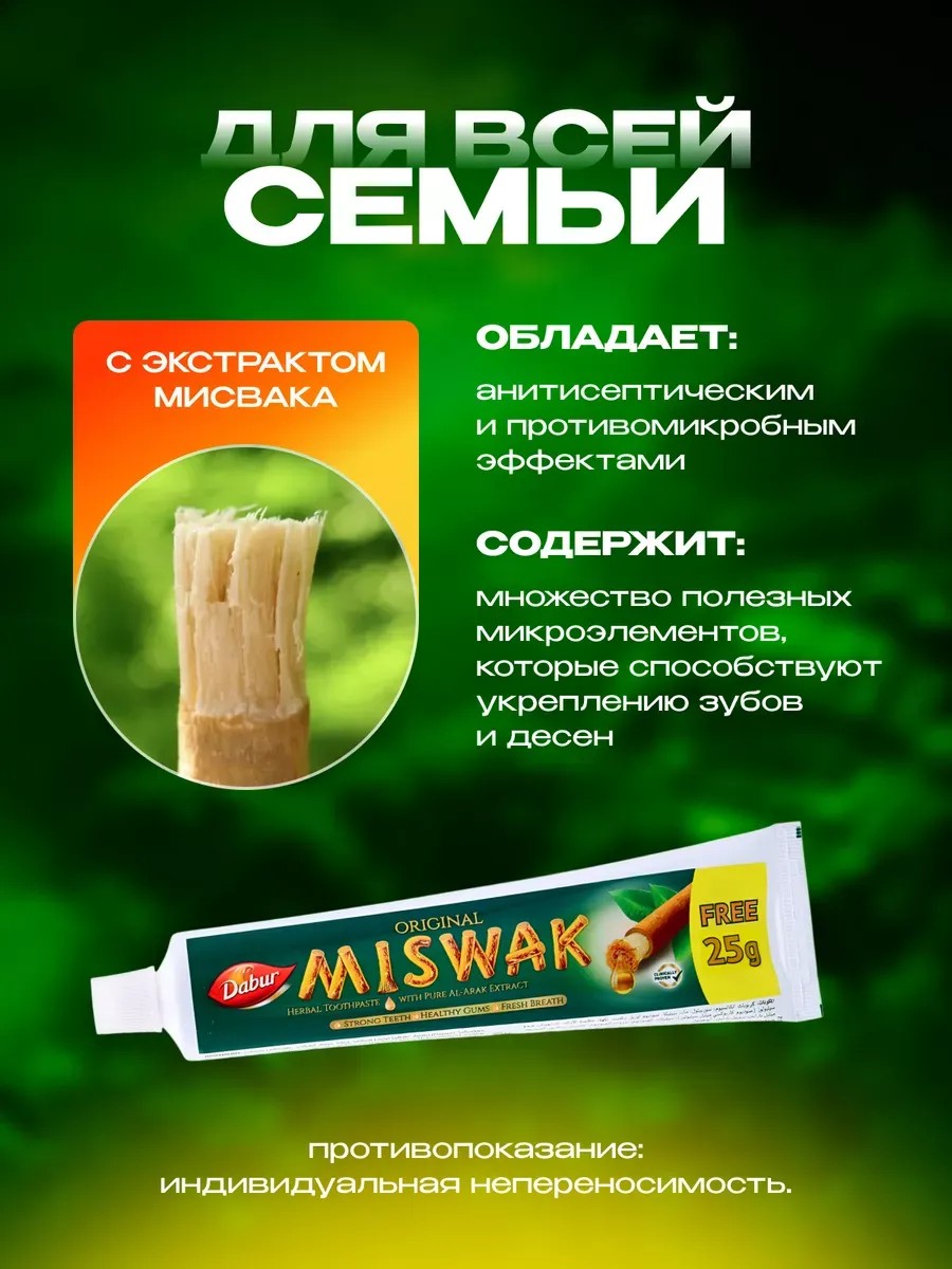 Dabur Miswak Toothpaste by Dabur. This whitening toothpaste is based on Al Arak wood. It is well-known in India for its antiseptic and cleansing properties. This Indian eco-friendly toothpaste contains abrasive, antimicrobial, bacteriostatic, stimulating, and surfactant ingredients. This toothpaste for sensitive teeth prevents plaque formation and cavities, relieves inflammation and redness of the gums, refreshes, leaves a pleasant aftertaste, prevents tartar buildup, reduces bleeding gums, and eliminates various oral infections. It provides high-quality oral cleansing and effective teeth whitening. Contains natural herbal ingredients (herbal), pure miswak extract, and anise extract. It prevents dental diseases and protects gums. It has a sweet anise flavor and has astringent and bactericidal properties. This medicinal herbal paste has a pleasant taste and smell, despite its medicinal ingredients. Miswak extract has been used for thousands of years and has both preventative and therapeutic properties. For sensitive teeth: Indian medicinal cosmetics, Clove. Adult anti-caries. Sensitive toothpaste. Indian meswak siwak. Preventive Indian Dabur Miswak. 3+ toothpastes, pasiya pastv siwak, abacus root. Also popular as Korean, Japanese, Thai, and Chinese toothpaste. Gum treatment, oral health, and ztsbnaya. In our store, you can purchase a toothpaste and toothbrush set, a small travel tube, and a red Dabur red toothpaste. This toothpaste is suitable for teenagers, children, adults, men, and women. Comprehensive care for the whole family. Perfectly eliminates bad breath by removing tartar. For smokers, for pregnant women, for cleaning, for dentures.