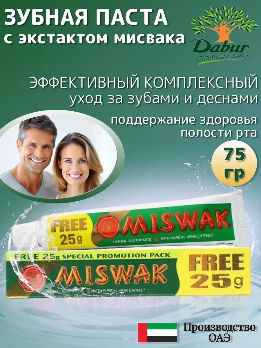 Натуральная зубная паста Dabur Miswak Herbal с экстрактом растения мисвак, обеспечивающая полную защиту зубов и дёсен. Мисвак зубная паста Дабур изготовляется с использованием чистого экстракта знаменитого дерева Мисвак (Salvadora persica). Отбеливающая зубная паста Мисвак обладает прекрасными антибактериальными свойствами, помогает уменьшить кариес, борется с налетом, укрепляет десны и зубы. Использование пасты с экстрактом мисвака укрепляет зубы, предохраняет от появления и дальнейшего развития кариеса, уменьшает зубную боль, освежает дыхание и устраняет плохой запах изо рта, укрепляет десны, а также придаёт зубам блеск и белизну. Экстракт мисвака (Salvadora persica) по своим химическим свойствам схож с такими антибактериальными и антикариесными веществами, как триклозан и хлоргексидин. Кроме того, в «мисваке» содержатся витамин С, танин, алкалоиды и флавоноиды. Состав:Calcium carbonate, sorbitol, Aqua, Silica, Sodium Lauryl Sulphate, Flavour, Salvadora Persica extract, Carrageenan, Sodium Carboxy Methylcellulose, Sodium Silicate, Sodium Benzonate, Glycerine, Sodium Saccharin, Methylparaben, Propylparaben, Eugenol.
