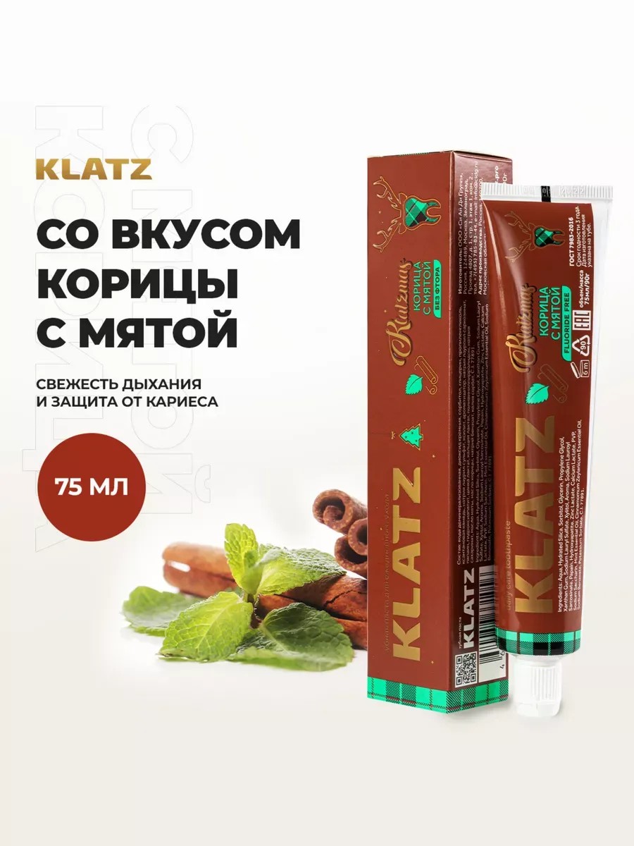 Klatz предлагает выбор оригинальных зубных паст из рождественской серии Klatzmas, создающей атмосферу зимних праздников и волшебства для всей семьи. Профессиональная паста без фтора со вкусом корицы и мяты превратит процесс чистки зубов в увлекательное путешествие в новогоднюю сказку, подарит приятное послевкусие и свежее дыхание. При регулярном использовании эмаль становится идеально гладкой и сводится к минимуму риск образования пищевого налета. Очищающая формула обеспечивает профилактику кариеса и болезней десен каждый день. Подходит для обычной или электрической щетки. Натуральный растительный фермента папаин и кремний — безопасно расщепляют налет, делая эмаль заметно белее, помогают в очищении и полировке. Органическое масло корицы — антибактериальный компонент, высоко эффективно для уничтожения стрептококков, провоцирующих появление кариеса. Масло мяты — обладает заживляющим и противовоспалительным свойствами, снимает воспаление мягких тканей. Ксилит — подавляет жизнедеятельность кариесогенной микрофлоры. Лактан кальция — способствует укреплению эмали. Цинк — оказывают успокаивающее действие на слизистую. Мужская и женская противоналетная ферментная паста с нежным освежающим мятным запахом станет хорошим подарком мужчине и женщине в Новый год и день рождения, 23 февраля или 8 Марата. Клатц professional — это pro tooth paste различного направления, которые работают на поддержание здоровья полости рта, предотвращают формирование зубного камня и кровоточивость десен. Благодаря качественным укрепляющим составам и современным технологиям гарантируем комплексный уход и гигиену. Для полноценной гигиены полости рта и здоровья зубов эксперты Klatz рекомендуют чередовать использование зубных паст с кальцием и с фтором. Срок годности после вскрытия – 6 месяцев.