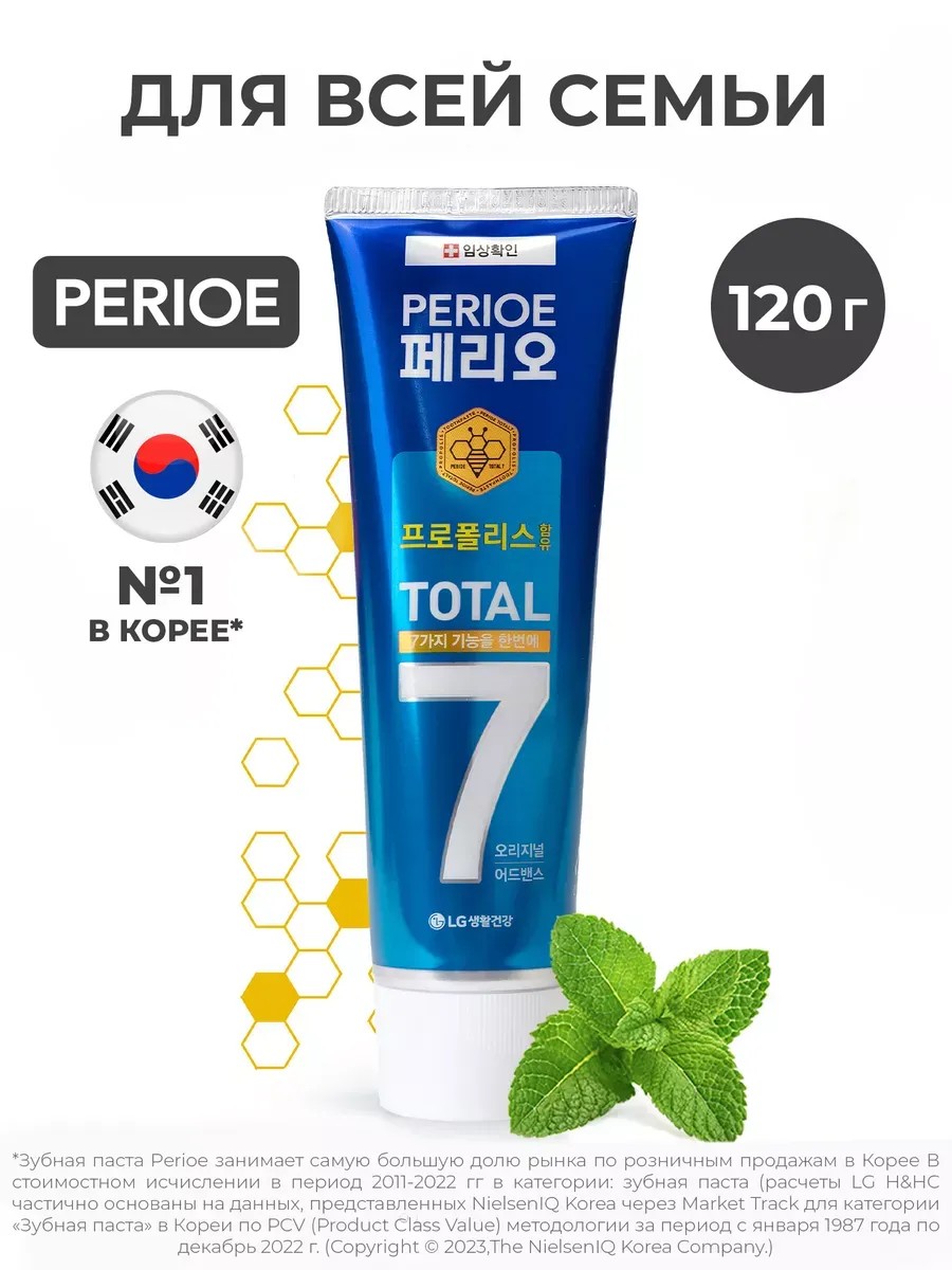 Корейская зубная паста Perioe (Перио) Total 7 original – эффективная и безопасная паста комплексного действия с натуральными компонентами и фтором (1000 ppm), которая решает сразу 7 задач по уходу за зубами и полостью рта. Подходит для всей семьи, отличается умеренным пенообразованием, экономичным расходом и нежным мятным вкусом. При регулярном применении предотвращает кариес и образование зубного камня, устраняет налет и неприятный запах изо рта, заботится о здоровье десен и укрепляет эмаль, обладает мягким отбеливающим эффектом. Мощный природный антибактериальный компонент – экстракт коры магнолии лекарственной устраняет 99,9% вредных бактерий, являющихся причиной заболеваний дёсен, в том числе гингивита и пародонтита. Натуральные экстракты алое барбаденис, зелёного чая, коры берёзы и витамин Е снимают воспаление, увлажняют слизистую рта, ускоряют регенерацию тканей и стимулируют обменные процессы в клетках. Экстракт розмарина предотвращает кровоточивость дёсен и борется с бактериями в труднодоступных местах и десенных карманах. Экстракт прополиса снимает отёчность дёсен, заживляет слизистую рта и оказывает противомикробное действие. Экстракт лимона деликатно отбеливает зубы, не повреждая эмаль, и защищает от налёта и кариеса. Использование комплексной зубной пасты Perioe Total 7 original не менее двух раз в день заметно улучшает состояние слизистой оболочки рта, подавляет воспалительные процессы и предотвращает потерю зубов, связанную с заболеванием или ослаблением дёсен, освежает дыхание и защищает от кариеса. Мягкая туба с колпачком, который не нужно закручивать и легко закрыть одним нажатием, вмещает 120 г зубной пасты, что в среднем на 25% больше, чем в обычном тюбике зубной пасты. В целях заботы об экологии все пасты Perioe в тубах выпускаются без фольгированной защиты.