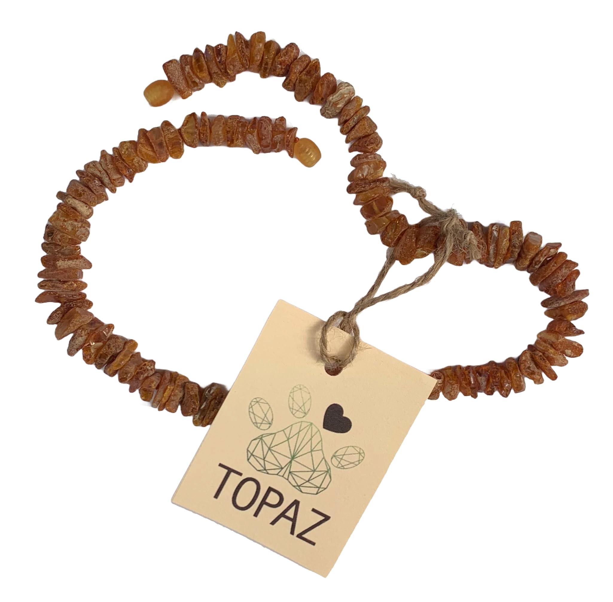 This handmade Topaz amber chain is a real one-off, made of natural Baltic raw-Bernstein.Bernstein is a pure natural product and every stone is unique, so the shape of the amber and the actual color from the photo can deviate somewhat.Each chain was carefully knotted by hand and the mountains were threaded on a robust thread, completed and provided with a reliable rotating lock.Rawbernstein collars for pets are not only used as jewelry for pets.They are also known for their natural prevention against ticks and fleas.The amber we use is the most valuable and oldest amber in the world and comes from the Baltic Sea area.All of our products are organic and 100 free of chemicals.The amber contains natural essential oils, with a pleasant resinous and spicy smell.This smell and the static charging of the amber can keep annoying parasites, such as ticks and fleas away from their pet. Instructions Not necessaryexchange of the amber chain - after about a year you will notice that the amber is polished by friction on the fur.This can close the pores of the amber and the essential oils can no longer fully develop.In this case, we recommend replacing the amber chain with a new one.Care-Please clean the amber chain every 4-5 weeks with clear water.Then put the chain in the sun for about 1 hour.Effect-the first time wearing an amber chain, it can take up to 2-3 weeks for the amber to have an effect.In order to achieve the full effect, the chain should be worn around the clock.If your dog cat carries the amber chain, please avoid combing it with a metal brush.The important electrical charge, as a defense against ticks and fleas, can lose its effect.Important note - please pay attention to the right size of the amber chain.For the correct seat of the chain, please measure the middle neck circumference.You should be able to put two fingers between the neck and chain.If it will be borderline, please order the next size.The chain should sit well, but not affect the breathing of your dog.For example, if your dog has a neck circumference from 30 cm to 33 cm, we recommend a 35 cm long chain.Free chemicals - all of our products are organic and 100 free of chemicals.The amber contains natural essential oils, with a pleasant resinous and spicy smell.This smell and the static charging of the amber can keep annoying parasites, such as ticks and fleas away from their pet.Rawbernstein from the Baltic Sea - Rohbernstein collars for pets are not only used as jewelry for pets.They are also known for their natural prevention against ticks and fleas.The amber we use is the most valuable and oldest amber in the world and comes from the Baltic Sea area.Certainly knotted - each chain was carefully knotted by hand and the amber stones were threaded on a robust thread, completed and provided with a reliable rotating lock.Natural tick protection - this handmade amber chain is a real one -off, made of natural Baltic raw -Bernstein.Bernstein is a pure natural product and every stone is unique, so the actual color from the photo can deviate somewhat.Diese handgefertigte TOPAZ Bernsteinkette ist ein echtes Einzelstück, gefertigt aus naturbelassenem baltischem Roh-Bernstein. Bernstein ist ein reines Naturprodukt und jeder Stein ist ein Unikat, daher kann die Form der Bernsteine, sowie die tatsächliche Farbe vom Foto etwas abweichen. Jede Kette wurde sorgfältig von Hand verknotet und die Bernsteine wurden auf einen robusten Faden gefädelt, abgeschlossen und mit einem zuverlässigen Drehverschluss versehen. Rohbernstein Halsbänder für Haustiere werden nicht nur als Schmuck für Haustiere verwendet. Sie sind auch durch ihre natürliche Vorbeugung gegen Zecken und Flöhe bekannt. Der Bernstein, den wir verwenden, ist der wertvollste und älteste Bernstein in der Welt und kommt aus dem Ostseeraum. Alle unsere Produkte sind organisch und 100 chemikalienfrei. Der Bernstein enthält natürliche ätherische Öle, mit einem angenehmen harzig-würzigen Geruch. Dieser Geruch sowie die statische Aufladung des Bernsteins können lästige Parasiten, wie Zecken und Flöhe von Ihrem Haustier fernhalten. GEBRAUCHSANWEISUNG nicht nötigAUSTAUSCH DER BERNSTEINKETTE - Nach etwa einem Jahr werden Sie merken, dass die Bernsteine durch Reibung am Fell poliert sind. Dadurch können sich die Poren des Bernsteins verschließen und die ätherischen Öle können sich nicht mehr vollständig entfalten. In diesem Fall empfehlen wir den Austausch der Bernsteinkette durch eine neue. PFLEGE – Bitte reinigen Sie die Bernsteinkette alle 4-5 Wochen mit klarem Wasser. Danach legen Sie die Kette für ca. 1 Stunde in die Sonne. WIRKUNG – Beim ersten Tragen einer Bernsteinkette kann es bis zu 2-3 Wochen dauern, bis der Bernstein seine Wirkung zeigt. Um die volle Wirkung zu erzielen, sollte die Kette rund um die Uhr getragen werden. Wenn Ihr Hund Katze die Bernsteinkette trägt, vermeiden Sie es bitte ihn sie mit einer Metallbürste zu kämmen. Die wichtige elektrische Aufladung, als Abwehrschutz gegen Zecken und Flöhe, kann damit ihre Wirkung verlieren. WICHTIGER HINWEIS - Bitte achten Sie auf die richtige Größe der Bernsteinkette. Für den richtigen Sitz der Kette, messen Sie bitte den mittleren Halsumfang. Sie sollten noch zwei Finger zwischen Hals und Kette stecken können. Sollte es vom Maß her grenzwertig sein bestellen Sie bitte die nächste Größe. Die Kette sollte gut sitzen, jedoch nicht die Atmung Ihres Hundes beeinträchtigen. Wenn Ihr Hund z.B. einen Halsumfang von 30 cm bis 33 cm hat, empfehlen wir eine 35 cm lange Kette. CHEMIKALIENFREI - Alle unsere Produkte sind organisch und 100 chemikalienfrei. Der Bernstein enthält natürliche ätherische Öle, mit einem angenehmen harzig-würzigen Geruch. Dieser Geruch sowie die statische Aufladung des Bernsteins können lästige Parasiten, wie Zecken und Flöhe von Ihrem Haustier fernhalten. ROHBERNSTEIN AUS DER OSTSEE - Rohbernstein Halsbänder für Haustiere werden nicht nur als Schmuck für Haustiere 