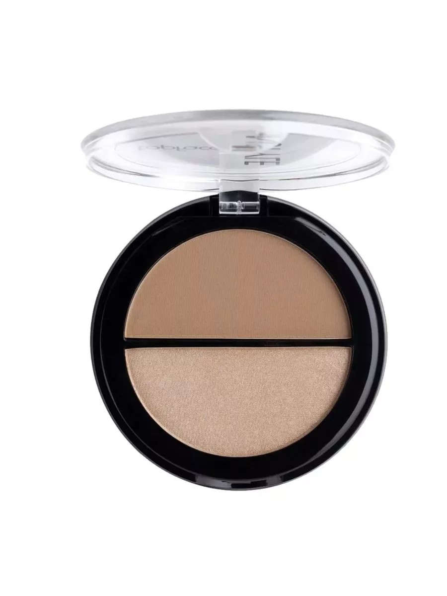 TopFace Instyle Contour Higligter, Хайлайтер тон 02 бледно-золотой, коричневый 10 г. Набор для сухого скульптурирования лица - корректор и хайлатер - в удобной и компактной палетке с содержанием Масла Камелии и Масла Макадамии в составе. Правильный оттенок корректора поможет создать красивый рельеф лица: подчеркнуть скуловую впадину, скорректировать форму и размер носа, выделить овал лица. Легкий перламутровый хайлайтер с мельчающими мерцающими частичками придаст коже холеный здоровый вид. Нанесите его на выступающую часть скул, под бровь и внутренний угол глаза, совсем немного пройдитесь по кончику или спинке носа, над губой, подбородку.