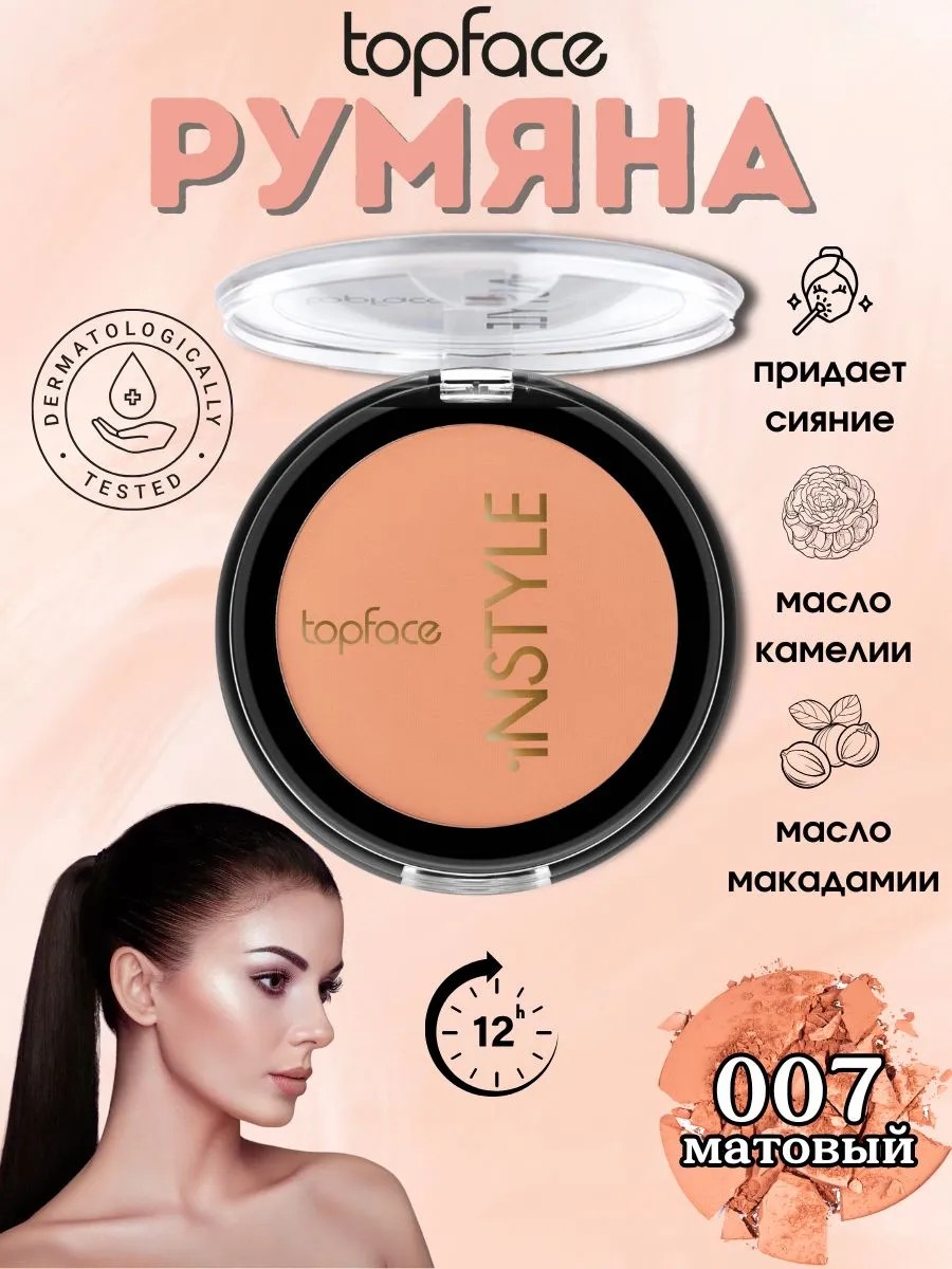 TopFace Instyle Blush On Румяна для лица No007 PT354 — это идеальный продукт для создания свежего и натурального румянца. Эти румяна подарят вашему лицу естественное сияние, при этом они легко наносятся и имеют стойкий эффект на протяжении всего дня. Благодаря мягкой текстуре и универсальному оттенку, румяна подходят как для повседневного, так и для вечернего макияжа.