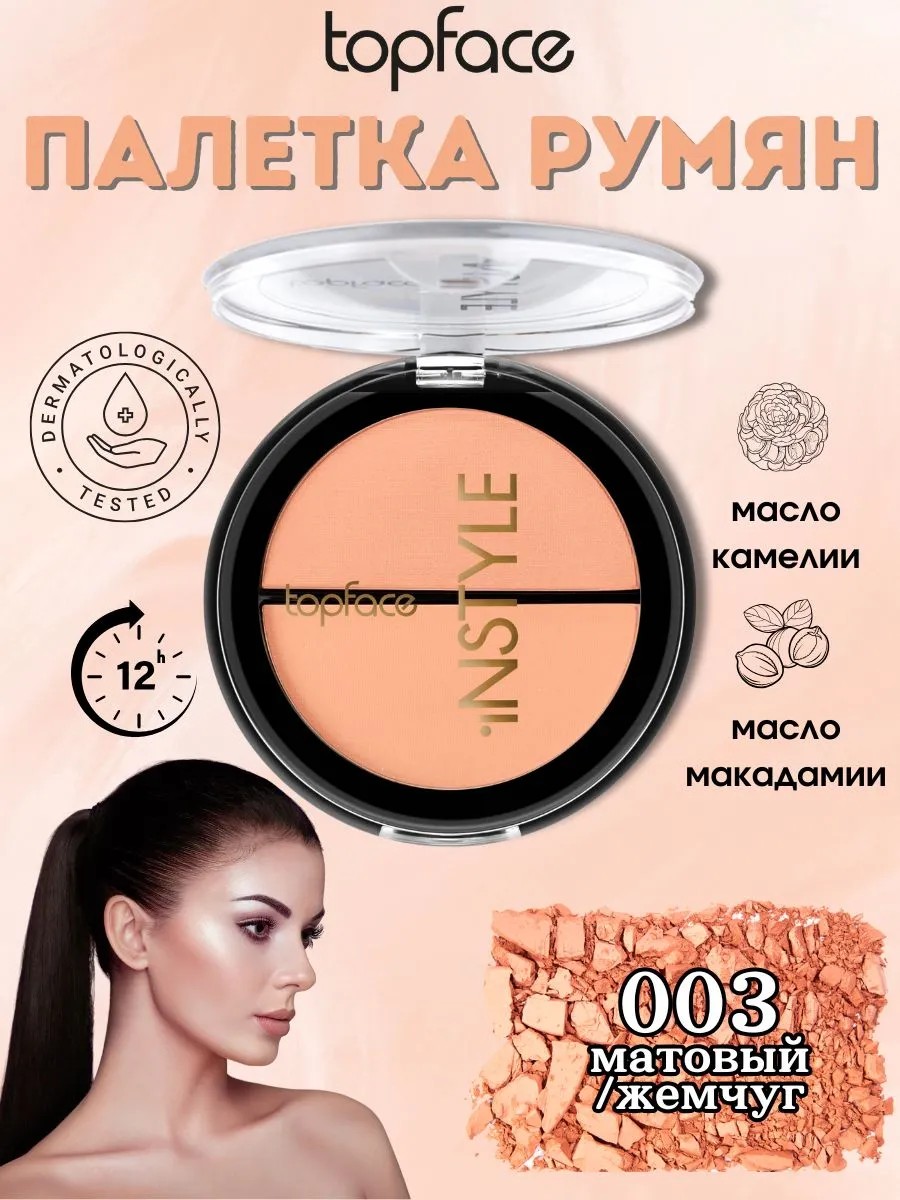 TopFace Instyle Twin Blush On Румяна для лица No003 PT353 – это идеальный продукт для создания естественного и свежего румянца на вашем лице. Румяна с двумя оттенками позволят вам добиться естественного, но яркого макияжа, подчеркивающего красоту вашего лица. Легкая текстура продукта позволяет легко наносить румяна и равномерно распределять их по коже, не оставляя пятен и утяжеляя макияж.