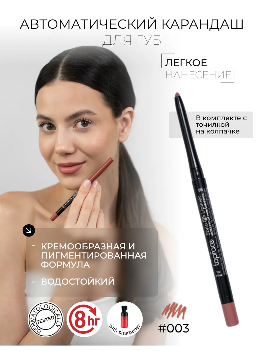 Topface Waterproof Lip Pencil delivers rich color and a flawless contour. The lightweight texture lasts all day and prevents lipstick and gloss from bleeding. Ideal for lining or creating a full lip look. The collection offers a wide range of shades, from beige to red. How to use: Outline your lips and blend inward to seamlessly blend with your lipstick or gloss. Or, apply the pencil to your entire lip. Long-lasting matte pencils from Topface. Nude lip pencil. Waterproof lip pencil.