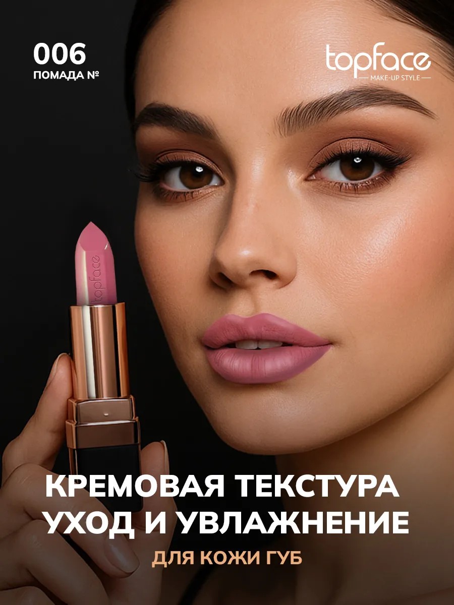Стойкая губная помада в стике тон №006 Pinky rosy от TopFace с питательным маслом моринги дает красивый нюдовый бежевый цвет, увлажняет сухие чувствительные губы и создает эффект бальзама, оставляя естественный сатиновый блеск.