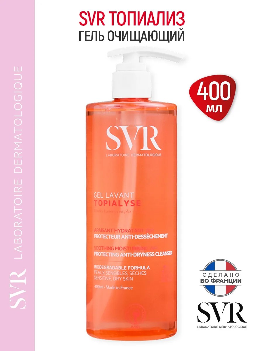 Гель очищающий 0+ для лица и тела СВР Топиализ (SVR Topialyse Cleansing Gel), 400 мл. СВР Топиализ очищающий гель создан для ежедневной гигиены сухой кожи лица, тела и интимных зон. Успокаивает кожу и обеспечивает длительный комфорт. Подходит для младенцев с рождения (за исключением недоношенных), детей и взрослых.