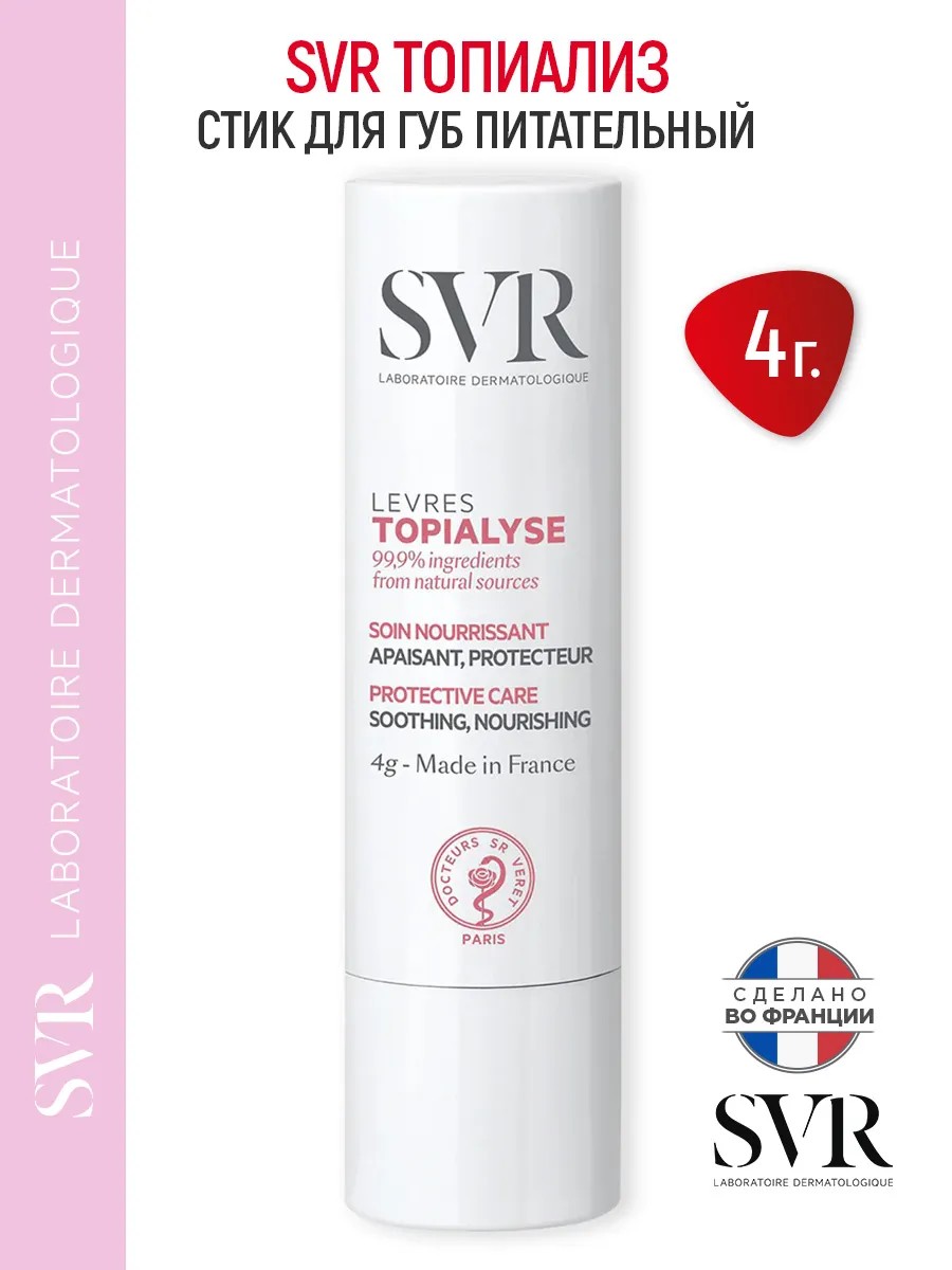 Стик для губ питательный СВР Топиализ (SVR Topialyse Lips), 4 г. SVR Топиализ Питательный стик для губ – это уход, специально разработанный для чувствительных, повреждённых и сухих губ. Кожа на губах очень тонкая и чувствительная, поэтому ей необходима защита от агрессивных факторов окружающей среды (ультрафиолетовых лучей, ветра, холода, загрязнений, курения). Эти факторы могут вызывать растрескивание, сухость, стянутость или даже покалывание и покраснение губ.