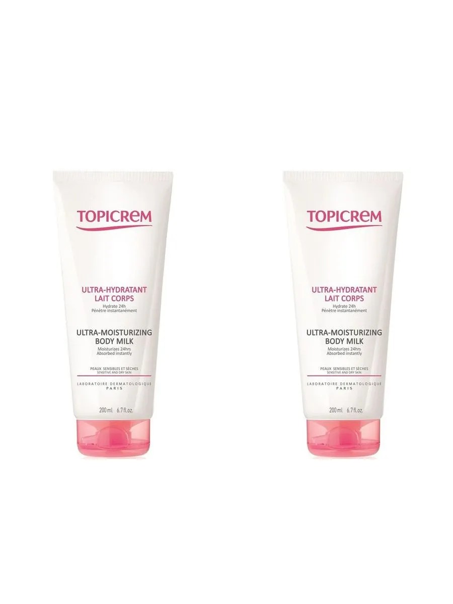 Topikrem Ultra-Moisturizing Body Milk 200ml. 24-hour hydration and protection for dry and sensitive skin. 9.5% glycerin, 2% urea. Original name: Ultra-Moisturizing Body Milk.