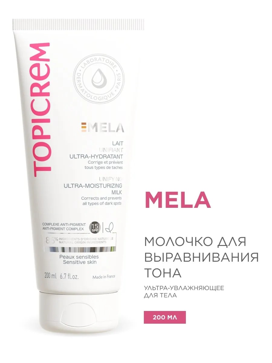 Ультра-увлажняющее молочко для тела подходит для чувствительной кожи, содержит солнцезащитный фильтр SPF15 (UVA/UVB), корректирует все типы пигментных пятен и предотвращает их появление, выравнивает тон кожи, интенсивно увлажняет кожу в течение 24 часов. Жидкая текстура, нежный аромат. Быстро впитывается. Комфортный, нежирный, нелипкий финиш. Кожа приобретает естественное сияние, становится гладкой и эластичной. Показания: чувствительная кожа любого оттенка. Активные компоненты: октадекадиеновая кислота и комплекс активных веществ Mela (никотинамид + экстракт водорослей). Состав: Aqua (Water), Glycerin, Caprylic/Capric Triglyceride, Dicaprylyl Carbonate, Octadecenedioic Acid, Diethylamino Hydroxybenzoyl Hexyl, Benzoate, Cetearyl Ethylhexanoate, Diethylhexyl Butamido Triazone, Ethylhexyl Triazone, Isopropyl Isostearate, Niacinamide, Acetyl Glucosamine, Glyceryl Stearate, Peg-100 Stearate, Sorbitan Stearate, Polysorbate 60, Cera Alba (Beeswax), Glyceryl Caprylate, Hydroxyacetophenone, Chlorphenesin, Parfum (Fragrance), Xanthan Gum, Caprylyl Glycol, Carbomer, Sodium Hydroxide, Cystoseira Tamariscifolia Extract, Tocopherol. Применение: нанесите на кожу тела утром и / или вечером.