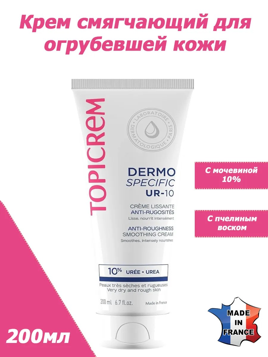 Topicrem UR-10: Крем смягчающий для огрубевшей кожи.Если ваша кожа страдает от сухости и огрубения, вам необходим надежный помощник в уходе — Topicrem UR-10. Этот крем, произведенный во Франции, относится к линии Dermo Specific, которая предлагает средства с кератолитическим действием для эффективного разглаживания грубой кожи. Подходит для всех возрастов с 3 лет, он станет идеальным решением для тех, кто сталкивается с проблемами сухой и огрубевшей кожи.Основные показания к применению включают фолликулярный кератоз и псориаз. Топикрем UR-10 содержит 10% мочевины, что способствует сохранению водного баланса, интенсивно увлажняет и предотвращает потерю влаги. Этот активный компонент работает в синергии с пчелиным воском, который эффективно смягчает, питает и восстанавливает защитный барьер эпидермиса. Результат применения — мягкая, увлажненная и нежная кожа, которая радует своим комфортом.Крем обладает приятной текстурой и цветочным ароматом, что делает его использование не только эффективным, но и приятным ритуалом ухода за собой. Наносите средство легкими массирующими движениями на участки с сухой, огрубевшей кожей, и вы заметите, как ваше тело становится более гладким и ухоженным. Топикрем UR-10прошел дерматологический контроль, что гарантирует его безопасность и эффективность. Он идеально подходит для тех, кто ищет решение для очень сухой кожи, восстанавливая ее эластичность и убирая чувство стянутости. Кроме того, крем помогает восстановить защитную липидную пленку, обеспечивая долговременный комфорт.Не упустите возможность подарить своей коже заботу и внимание, которые она заслуживает. Topicrem UR-10 — это не просто крем, это ваш надежный защитник в борьбе с сухостью и огрубением кожи. Сделайте шаг навстречу мягкости и комфорту уже сегодня!