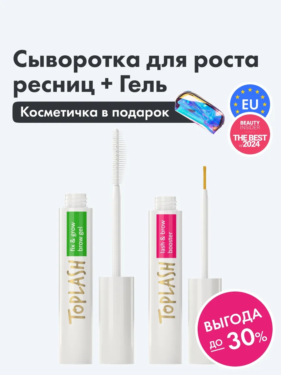 Набор из двух средств. Проверенное средство для роста ресниц и бровей в выгодном формате. Набор включает продукты-бестселлеры бренда Toplash, а также практичную компактную косметичку для их удобного хранения. Стиль, красота, доказанное действие - всегда с вами, работает без исключений.Что входит в набор: 1. Toplash Lash and Brow booster 3 мл. Сыворотка для роста ресниц и бровей, стимулирующая волосяные фолликулы. В результате волоски растут быстрее, становятся объемней, приобретают насыщенный пигмент и блеск. Действующие вещества с регенеративным и защитным эффектом. Заметный результат всего за три недели ежедневного нанесения. 2. Toplash Fix and Grow brow gel 6 мл. Гель для укрепления и фиксации бровей с двойным эффектом: гибкая фиксация волосков, ухоженный вид, красивая форма, а также многокомпонентное питание от корней до кончиков. Уникальная лечебно-декоративная косметика, с которой вы выглядите ярко и уверенно. 3. Косметичка