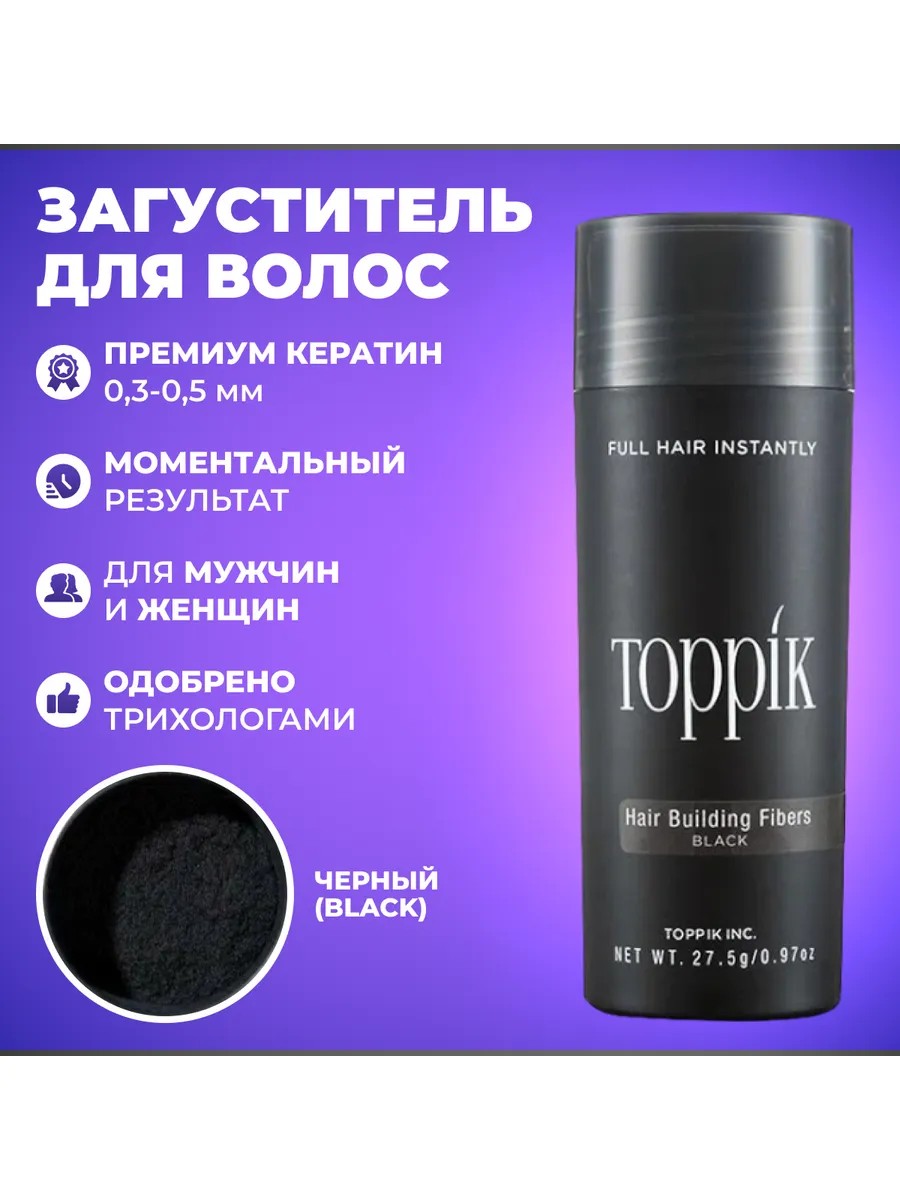 Загуститель для волос и бороды – секрет вашей красивой и объемной прически. Профессиональное средство ToppiK станет отличным решением для мужчин и женщин с сединой, тонкими и редкими локонами или залысинами. Микроскопические волокна пудры длиной 0,3-0,5мм закрепляются на волосах и держаться весь день, не осыпаясь. Они добавляют объем, который смотрится максимально натурально под естественным и искусственным освещением. В составе загустителя премиальный и полностью безопасный для волос и кожи головы кератин. Устойчивый результат остается на волосах до следующего мытья головы. Это отличный выбор для маскировки проплешин и зон, склонных к облысению. Смываемый косметический состав легко и быстро наносится. Он прост в применении и представлен в большом количестве цветов и оттенков. Подобрать подходящую пудру – загуститель смогут обладатели черных и темно – коричневых, теплых и холодных темных, средних и светло - русых волос. Отлично маскирующее недостатки средство подойдет для пожилого человека, взрослого мужчины и женщины, девушки и парня. После нанесения оно добавляет цвета и пышности корням, скрывает отросшую седину и маскирует пробор. Это также отличный выбор для придания плотности и густоты мужской бороде. При распылении сухой пудры достигается идеальный естественный эффект камуфляжа. Средство станет отличным выбором для использования в домашних условиях или в парикмахерских и салонах красоты. Оно фиксируется на волосах в течение нескольких секунд. Состав поставляется в удобном флаконе с крышкой. Масса продукта составляет 27,5 грамм. Это отличный выбор для ухода за женскими и мужскими волосами. Маскирующее средство подойдет тем, кто столкнулся с проблемой алопеции или выпадения волос. У нас есть акции и распродажи, вы можете купить наши товары в подарок со скидкой!