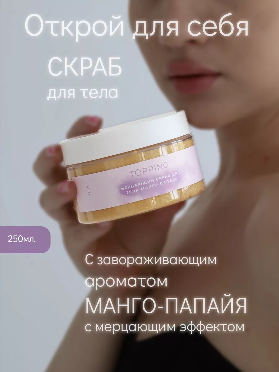 Погрузитесь в мир сладости и умиротворения с мерцающим скрабом для тела с ароматом манго-папайя.