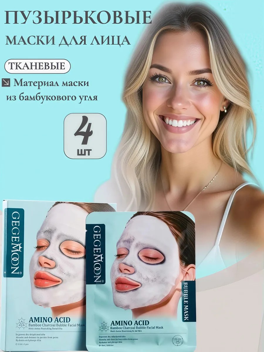 Набор тканевых для лица - 4 штуки Пенящаяся тканевая маска создана специально для максимально глубокого очищения пор от загрязнений, остатков макияжа и излишков себума. При взаимодействии с воздухом маска активируется и образует насыщенные кислородом пузырьки. Они создают на коже эффект микромассажа, слегка разогревая её и усиливая обменные процессы в клетках. Вытяжка из бамбука призвана обеспечить оптимальный уровень увлажнения, подтянуть и укрепить контуры лица, сделать кожу более гладкой и упругой.