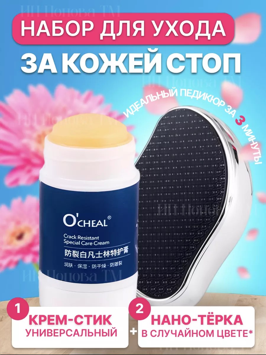 Набор педназначен для ухода за кожей и состоит из нано теки и бальзама стика. 1) С нано пензой просто очистить кожу от натоптышей, мозолей и трещин без посещения спа салонов, в домашний условиях. Чудо nano пилка прибор нового поколения, с покрытием из стекла, абразивная поверхность терки с множеством мелких зубцов, идеальна для шлифовки, отшелушивания огрубевших пят не вызывает аллергии, безопасна. 2) Бальзам стик поможет быстро справиться с сухостью и микро трещинками на коже рук, ног, локтей, и других участков тела.Мультифункциональный бальзам стик также подойдет для ухода за кожей губ, носогубных складок, используйте как стик для лица. Активные компоненты крем для рук мгновенно смягчают и успокаивают эпидермис, образуют защитную изолирующую пленку и укрепляют эпидермальный барьер, обеспечивая также антивозрастной уход за руками.Так же используется как крем для ног или крем для ног от трещин обеспечивает надежную защиту кожи от внешних агрессивных факторов.