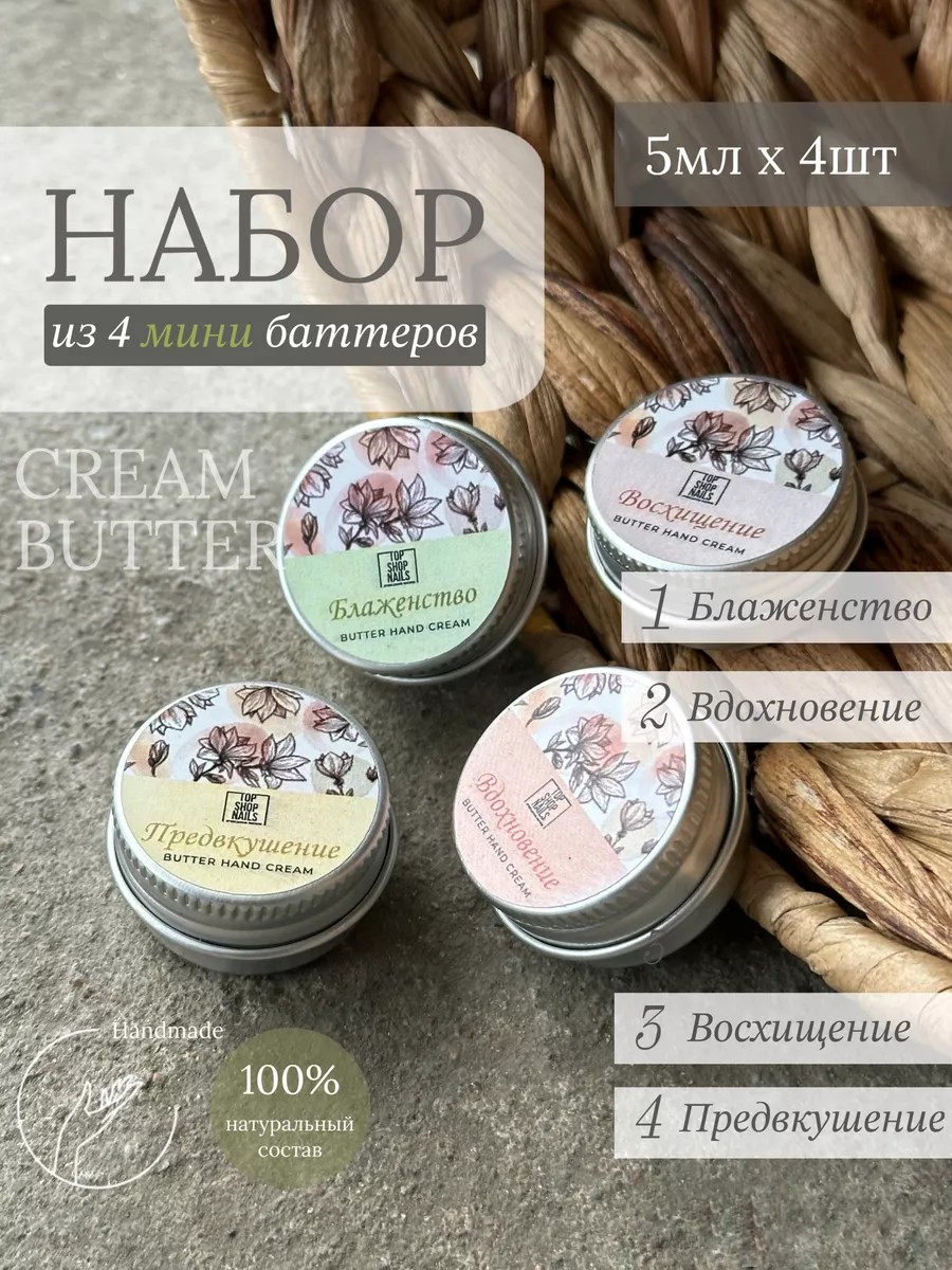 A set of four hand and cuticle cream butters (Bliss, Inspiration, Delight, Anticipation) - 20 ml. Each cream butter is 5 ml. The dense, velvety texture of the cream butter saturates skin cells with phospholipids, promoting the regeneration of damaged areas and strengthening the epidermal layer, preventing dehydration and aging. The cream butter deeply nourishes and intensively moisturizes, softens rough areas and protects against flaking and dryness. Natural solid oils with an improved formula and a convenient format. Completely handmade. Cream butters gently melt in contact with your skin, moisturizing, nourishing, and energizing! Suitable for daily hand and body care, as well as for an additional mini-relaxation procedure after a manicure.