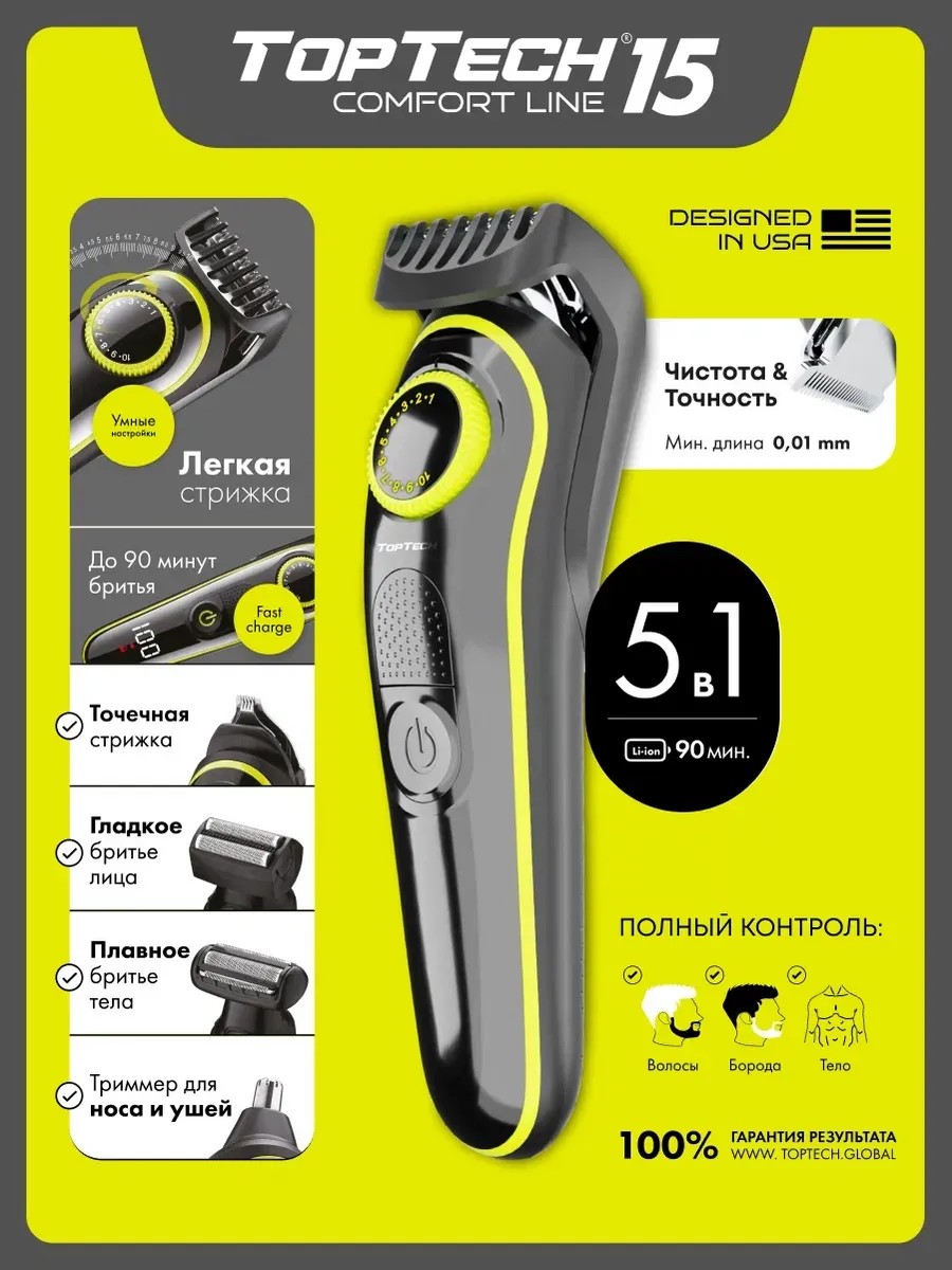 Электробритва Comfort Line 15 от toptech — это идеальное решение для комфортного и эффективного бритья. Модель оснащена мощным Li-Ion аккумулятором, обеспечивающим до 90 минут автономной работы после 90-минутной зарядки. Влагозащитный корпус позволяет использовать бритву в душе, а OLED-дисплей отображает уровень заряда и состояние блокировки. В комплект входят 5 насадок для бороды, носа, ушей и усов, что делает Comfort Line 15 универсальным инструментом для ухода за facial hair.
