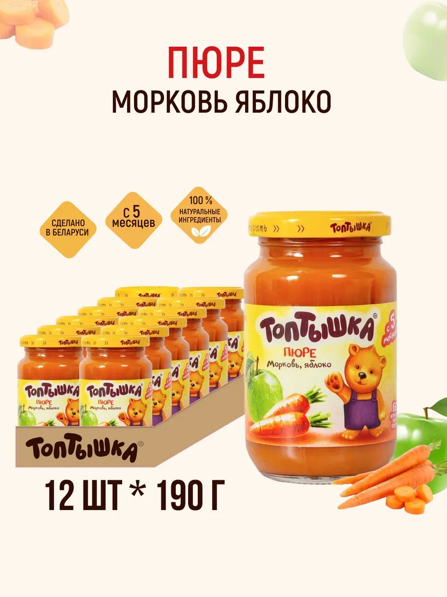 This is incredibly delicious! Inside each jar is more than just a product. Inside is our energy, our responsibility, and our desire to make this world a better place. Baby food "Toptyshka" is made from natural, environmentally friendly raw materials without the use of genetically modified ingredients, flavors, artificial colors, flavor additives, and preservatives. Recommended for children from 5 months, starting with 1/2 teaspoon 2 times a day, gradually increasing to 100 g per day by 12 months. Caution!!! Open immediately before use. If there is no cotton at the time of opening, do not eat. The manufacturing date is indicated on the lid. The shelf life of canned food from the date of manufacture, when stored at a temperature of 0 to 25 degrees Celsius and a relative humidity of no more than 75%, is 2 years. The product must be protected from direct sunlight. After opening, store in the refrigerator at a temperature of 0 to 6 degrees Celsius for no more than 24 hours. baby puree, fruit puree, puree,