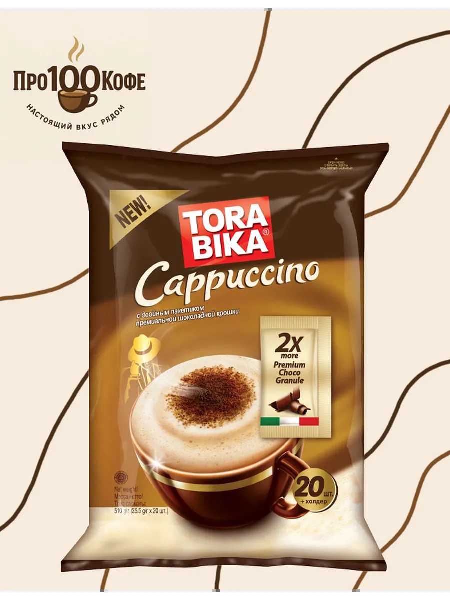 Torabika Cappuccino, a coffee drink with a bag of chocolate chips and thick foam, prepared according to an Italian recipe, will appeal to every cappuccino connoisseur.