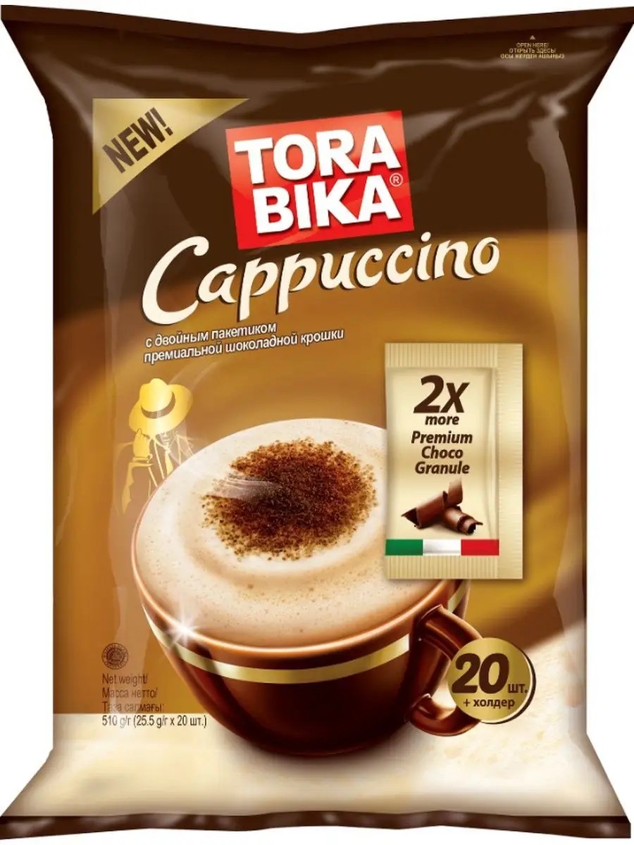Torabika Сappuccino в обновленном дизайне. Двойное удовольствие в новом увеличенном формате с дополнительной порцией шоколадной крошки. Настоящий подарок для хорошего начала дня − это превосходный кофе, изготовленный из отборных вулканических зёрен по самой современной технологии INSTANT COFFEE в Индонезии. Кофейный напиток Torabika Cappuccino с двойной порцией шоколадной крошки и густой пенкой, приготовленный по итальянскому рецепту, придется по вкусу каждому ценителю капучино. Кофе 3 в 1