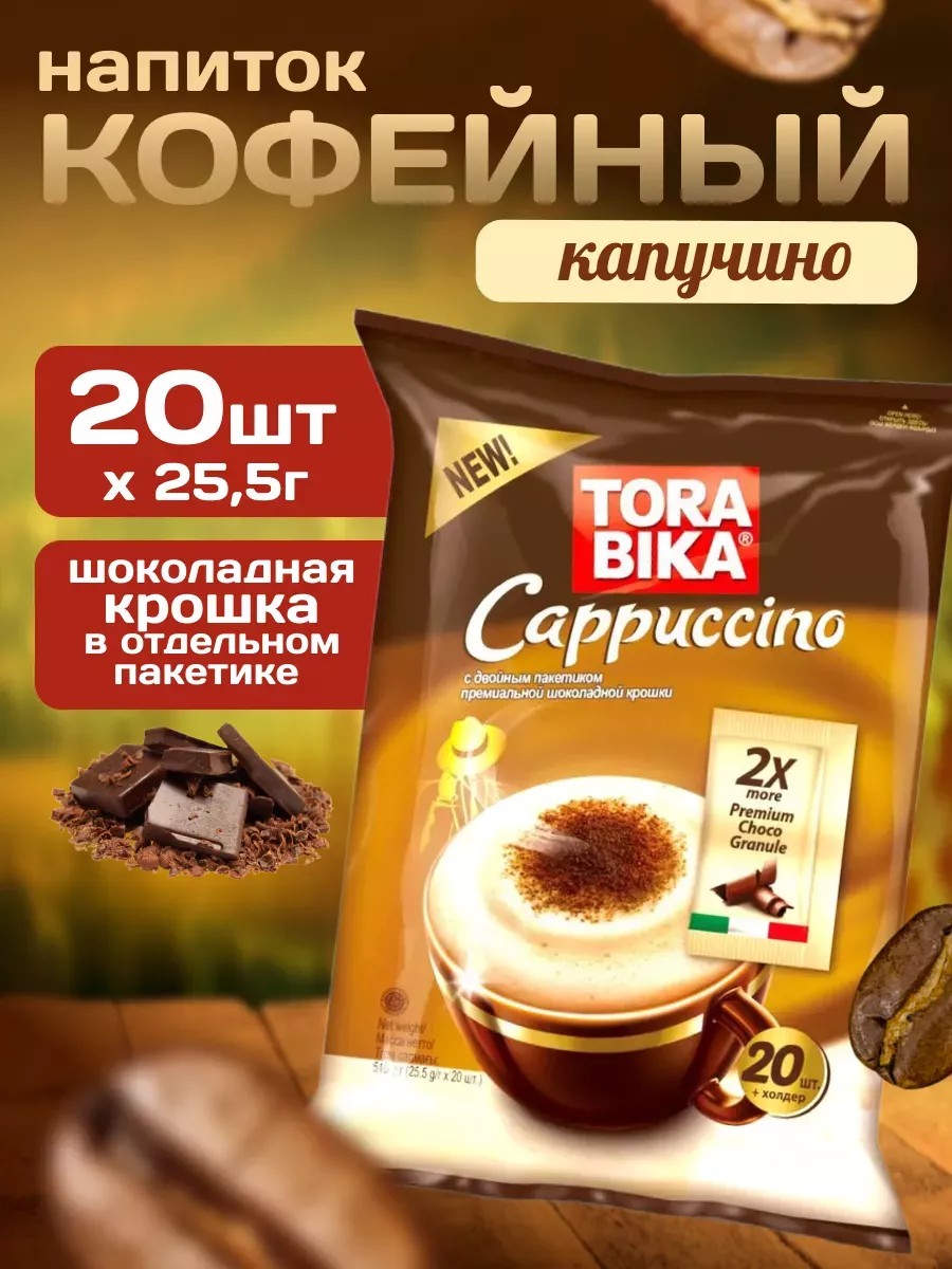 Индонезийский растворимый кофе с обильной сливочной пенкой и дополнительным пакетиком шоколадной крошкой Tora Bika Капучино не содержит ГМО. Изготавливается по уникальной технологии INSTANT из настоящих кофейных зерен.