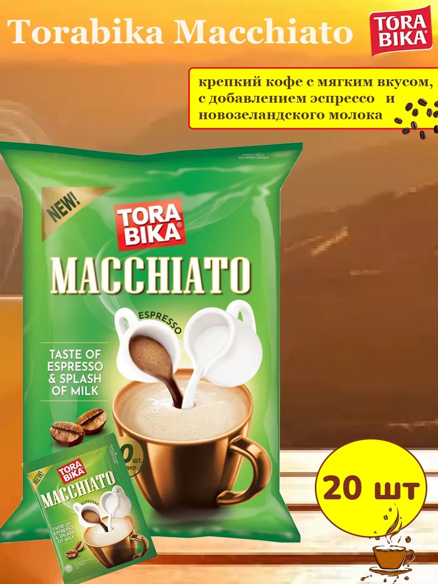 Torabika Macchiato – растворимый кофе высочайшего качества из Индонезии. Марка ведет свою историю на протяжении 65 лет, имея представительства более чем в 100 странах мира. Растворимый кофе Torabika производится с 1990 года. Ключевым компонентом кофе является высококачественная арабика, выращенная на экологически чистой территории вулкани.