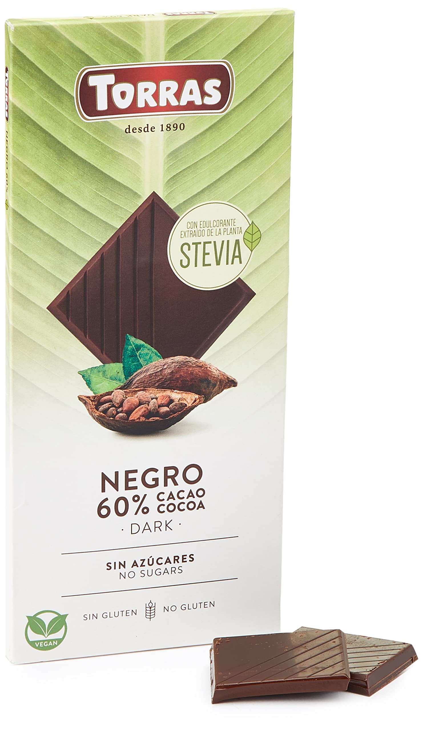 Torras Stevia Dark Chocolate Bar. Gluten-free and with no added sugar, this rich chocolate bar is suitable for diabetics and those looking to reduce their sugar intake. Sweetened with stevia. INGREDIENTS Cocoa mass: Sweeteners: Erythritol: Steviol glycosides: Cocoa butter: Inulin: Defatted cocoa powder: Soy lecithin: Vanilla flavor