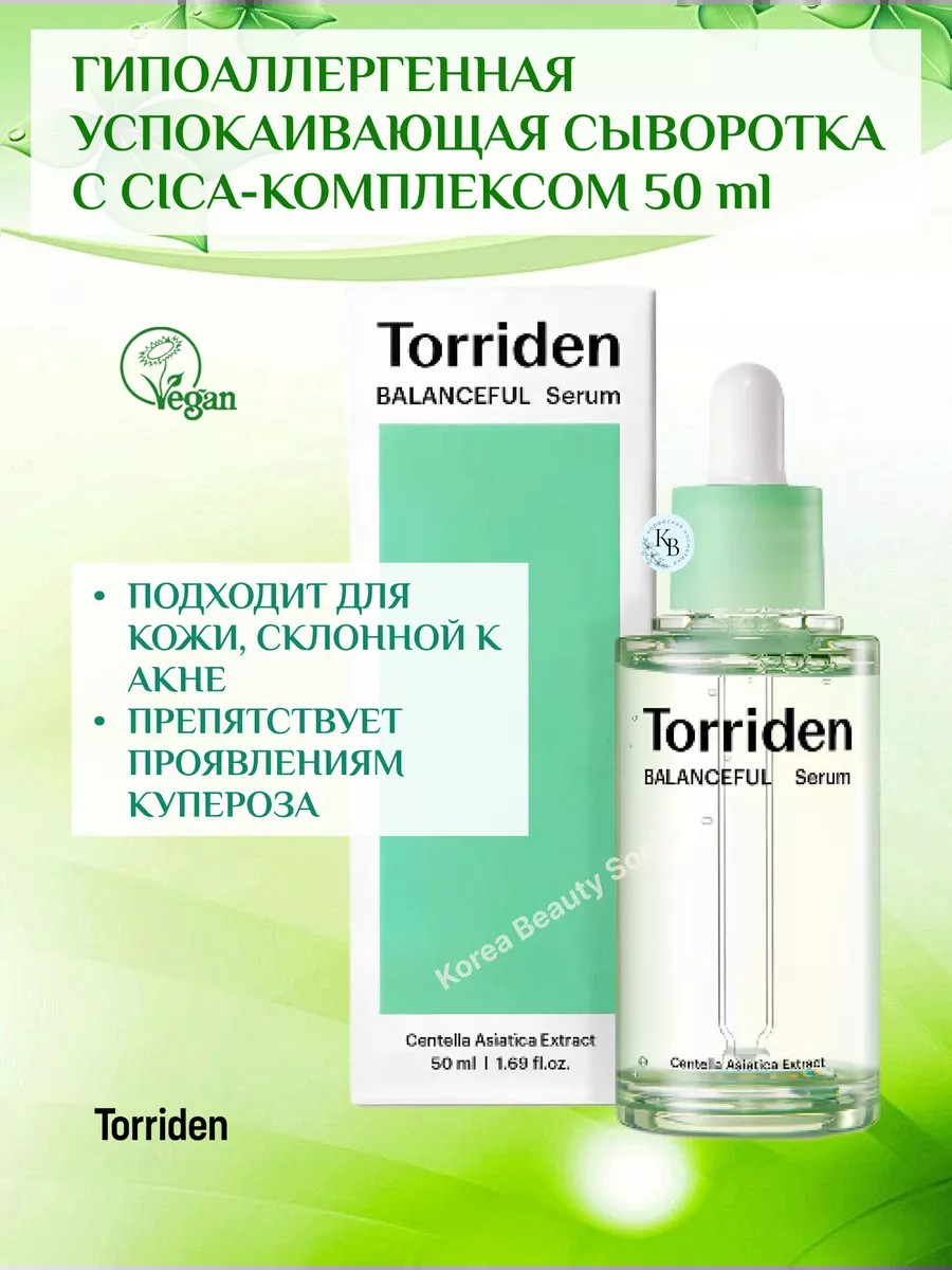 Torriden Balanced Cica Serum, a hypoallergenic soothing serum with CICA complex (50 ml), relieves irritation and redness, softens and moisturizes damaged skin, and eliminates tightness and discomfort.