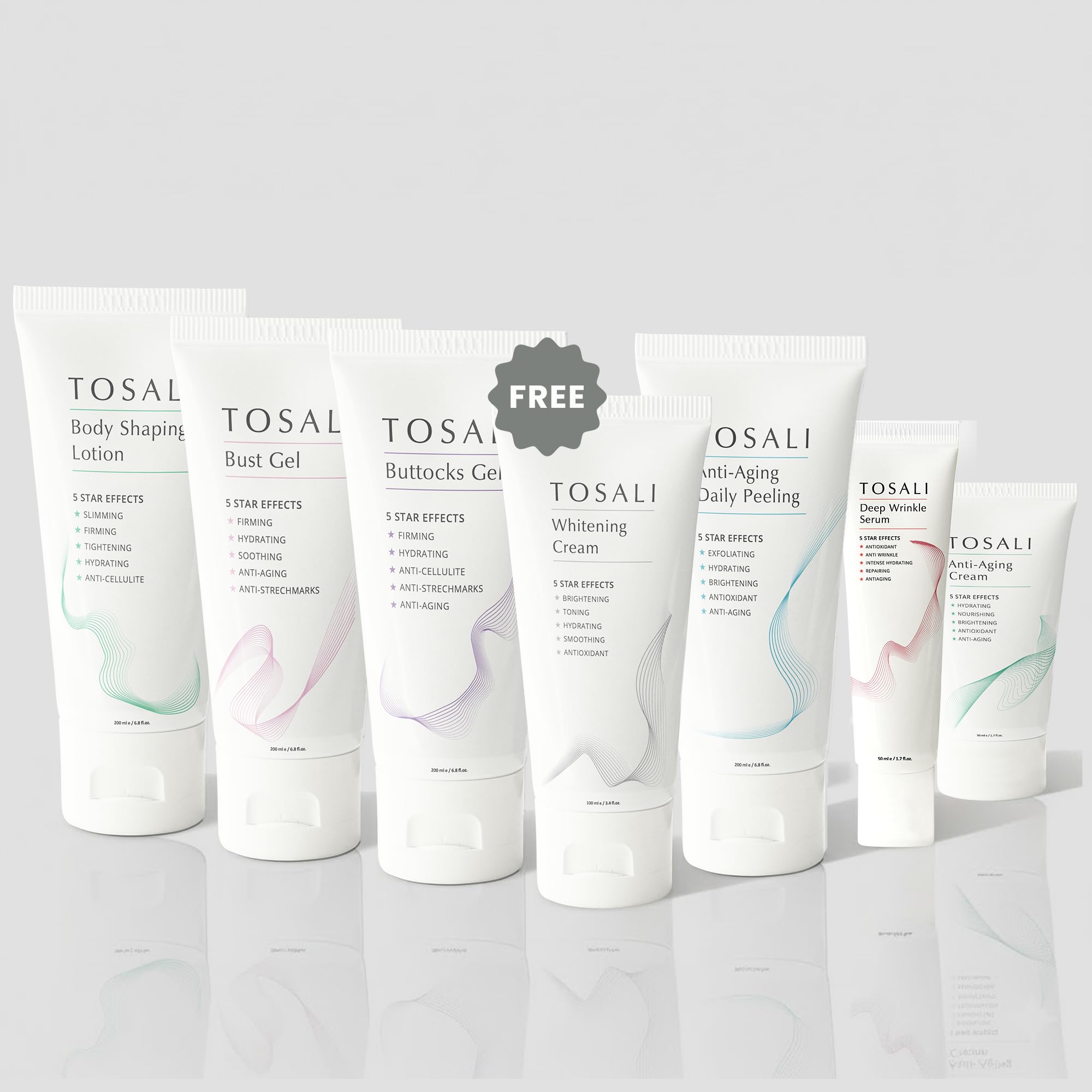 Elevate your skincare routine with the Tosali Firming Skincare Set, a complete system designed to hydrate, tighten, and rejuvenate your skin from head to toe. This all-in-one set includes a Buttocks Gel, Breast Firming Cream, Body Lotion, Peeling Mask, Wrinkle Serum, and Face Cream—each formulated with potent ingredients to deliver visible results. A powerful blend of Niacinamide, Arbutin, Vitamin C, and Hyaluronic Acid helps combat signs of aging while promoting a more even and radiant complexion. Caffeine and essential oils provide an instant tightening effect, enhancing skin elasticity and firmness over time. The deeply moisturizing formulas ensure long-lasting hydration, keeping skin soft, supple, and nourished throughout the day. Arbutin and Glutathione work to refine and balance skin tone, offering antioxidant protection while improving overall clarity. Made with non-irritating ingredients, these products are gentle enough for daily use and seamlessly fit into any skincare routine. As an added bonus, the set includes a free nourishing cream to further enhance hydration and maintain a smooth, refreshed look.Includes a Free Nourishing Cream: This set comes with an additional skincare cream designed to enhance skin softness, maintain hydration, and support a smooth and refreshed complexion. Gentle and Safe for Daily Use: Made with non-irritating ingredients suitable for different skin types, each product is designed for easy application and effortless incorporation into your daily routine. Targeted Skin Tone Support: Formulated to refine and balance skin tone, this skincare set contains Arbutin and Glutathione, which offer antioxidant benefits while improving overall skin clarity. Intensive Hydration Complex: Featuring deeply moisturizing compounds in various textures, this set ensures long-lasting hydration, keeping your skin smooth, supple, and nourished throughout the day. Advanced Body Sculpting Firming: Specialized formulas work on multiple areas from face to body, with key ingredients like caffeine and essential oils that provide an instant tightening effect while enhancing skin elasticity and firmness over time. Complete Anti-Aging Skin Revitalizing System: A potent blend of Niacinamide, Arbutin, Vitamin C, and Hyaluronic Acid helps combat visible aging signs while promoting a more even and healthy looking skin tone across the face and body.