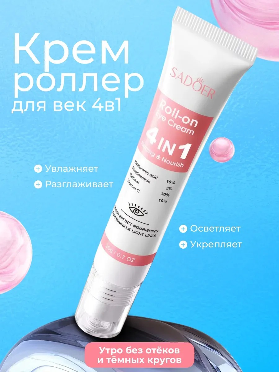 Питающий массажный крем для век с роликовым охлаждающим массажером помогает ежедневно бороться с первыми признаками увядания кожи лица и благодаря крему для кожи вокруг глаз эффективно устраняет проблемные места, следы усталости и отечности. Подходит крем для лица как для женщин и девушек, а также для мужчин всех возрастов, для всех типов кожи, включая чувствительную и сухую, комбинированную и жирную. Благодаря специальным тройным шарикам, которые распределяют коллагеновый крем, создаётся восстанавливающий эффект лифтинга, охлаждения и легкого лимфодренажного массажа. Смягчающий роллер для век и области вокруг глаз, позволяет заметно подтянуть и повысить упругость лица, обеспечивает антивозрастную защиту и не вызывает раздражения. Активные омолаживающие компоненты в составе декоративной уходовой косметики являются природными, увлажняют и насыщают витаминами, а так же осветляют и подтягивают кожу, выравнивая тон и микрорельеф, устраняют отеки, синяки и тонкие заломы, создается эффект до и после. Аллантоин и глюкоза в составе нашего средства влияют на обновление эпидермиса, нейтрализуют воздействие свободных радикалов и замедляют старение клеток, а также способствуют подтяжке, снятию мешков под глазами, разглаживанию и коррекции морщин. Косметический уходовый ролик для век позволит вашему лицу становится более гладким и свежим, подтягивающий бьюти эффект даст омоложение, восстановление и красоту вашему лицу. Благодаря легкой гиалуроновой текстуре его можно наносить как утром, так и вечером. Удобный флакон легко поместится в сумочку. Способ применения, на очищенную кожу нанесите корректирующий крем от отеков, проводя по массажным линиям, после нанесения продвигайтесь по верхней орбитальной косточке от внутреннего угла глаза к внешнему и по нижней от внешнего ко внутреннему.